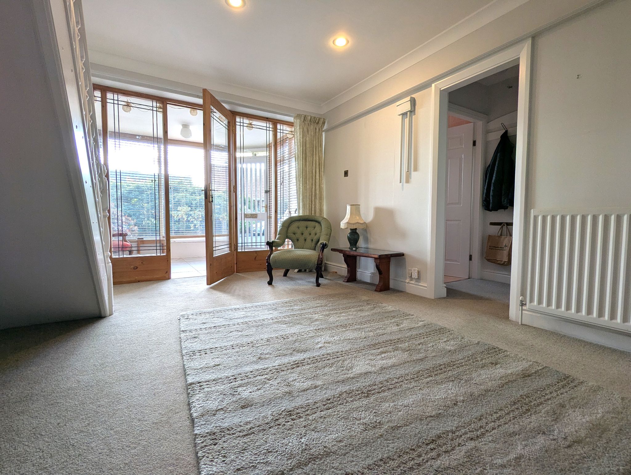Entrance Hall - 16'1 x 10'9 (4.93m x 3.35m) - Go through the French door into large open entrance hall which fills with natural light thanks to the window setting of the porch. With carpeted flooring, this spacious hall offers access to a lounge, dining room, kitchen with a breakfast area, master bedroom and second bedroom (currently used as a study), bathroom, separate WC and carpeted staircase to the first floor. Wall mounted radiator.