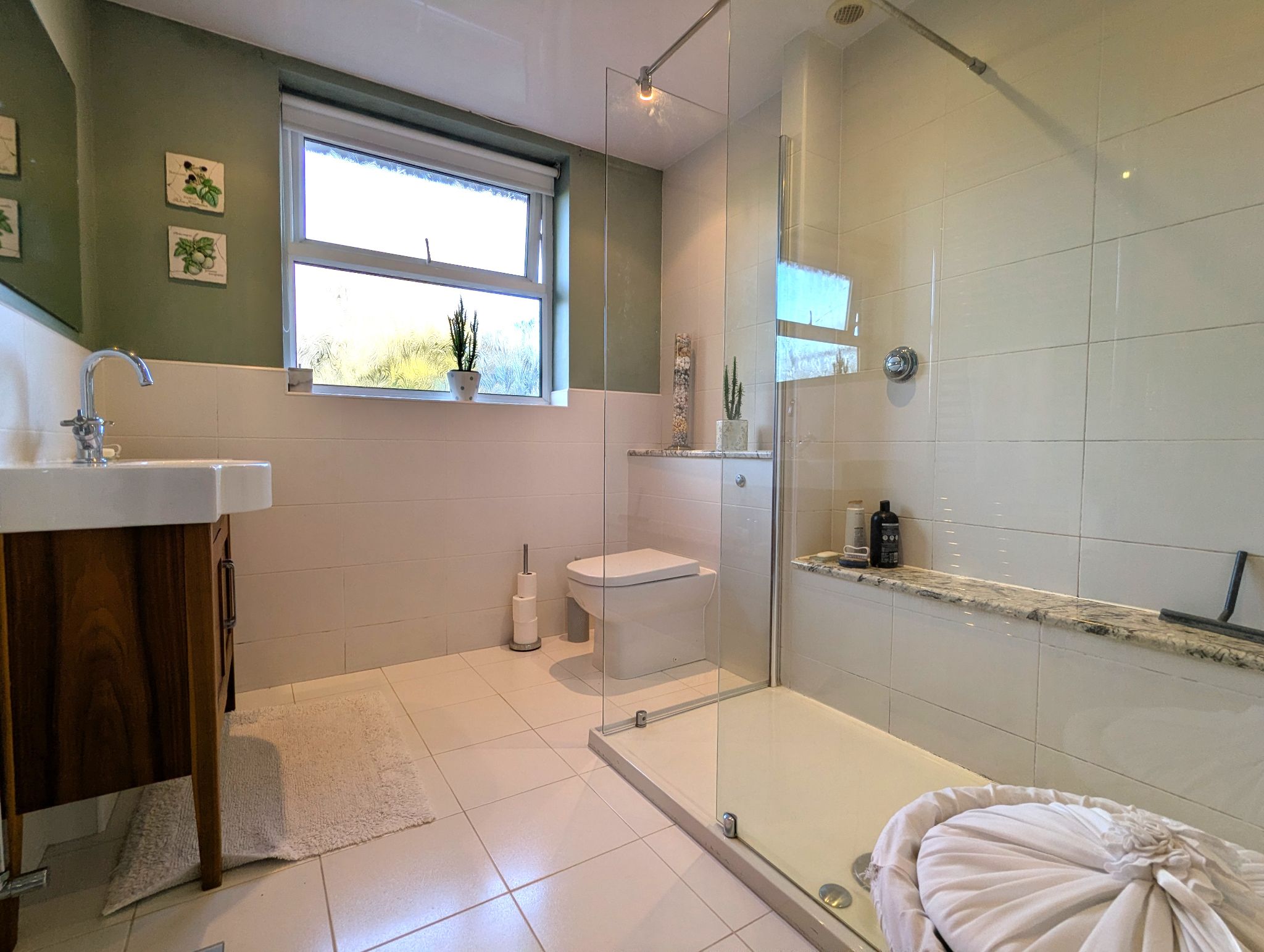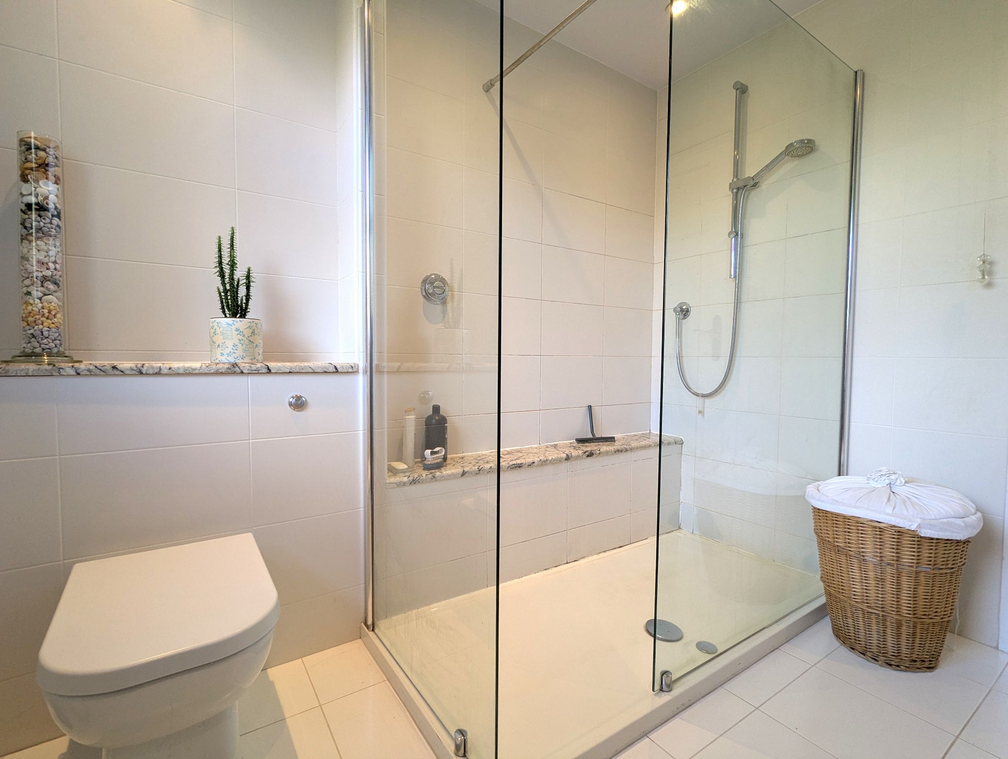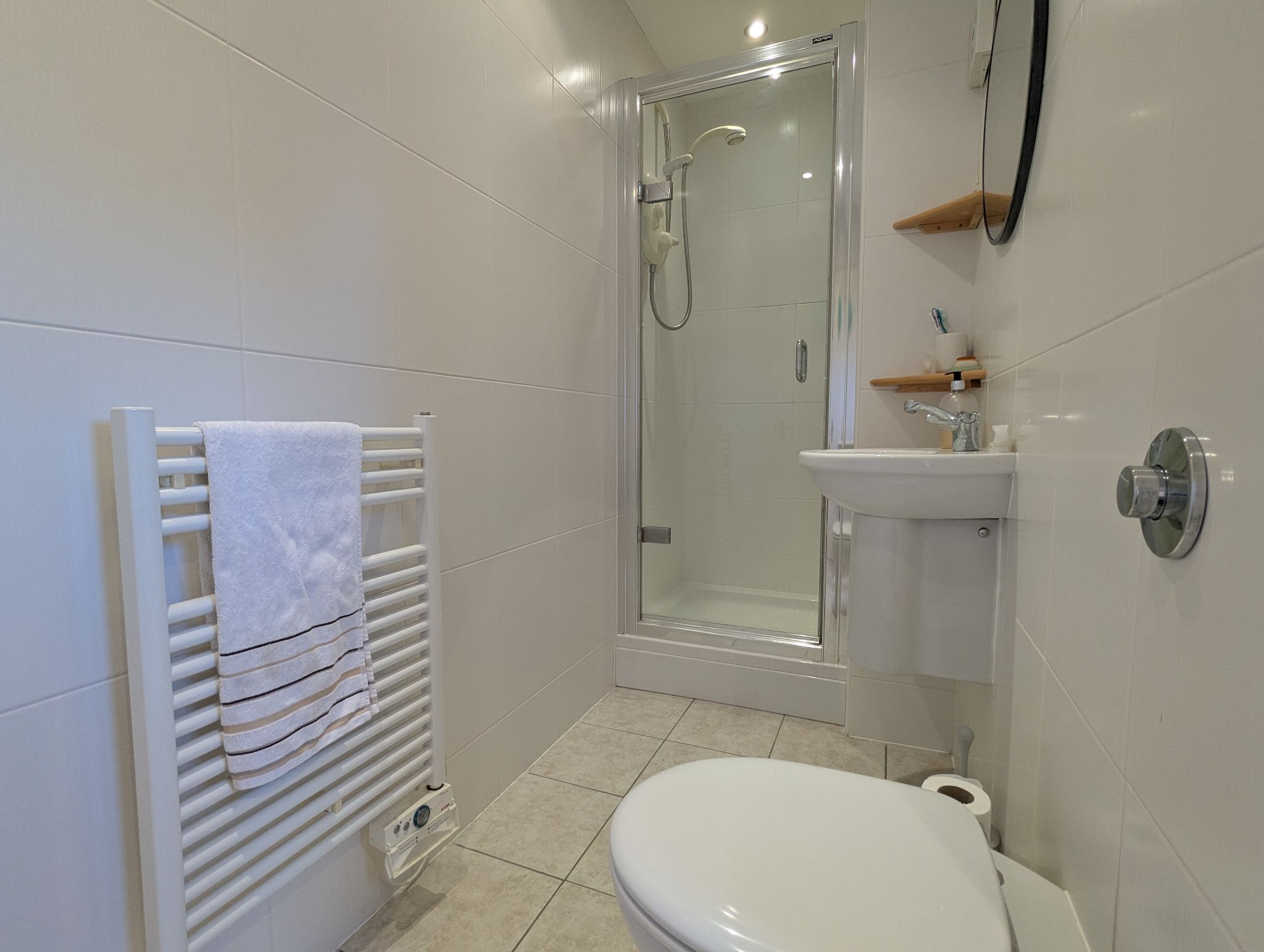 Shower Room 8’7 x 7’3 (2.68m x 2.24m) A stylish, bright and modern shower room with tiled flooring, under floor heating and splashback. Access to a toilet, vanity unit with fitted wash basin and walk-in shower unit with a mains supplied mixer shower and seating area. Rear-facing UPVC double glazed window and wall mounted heated towel rail.