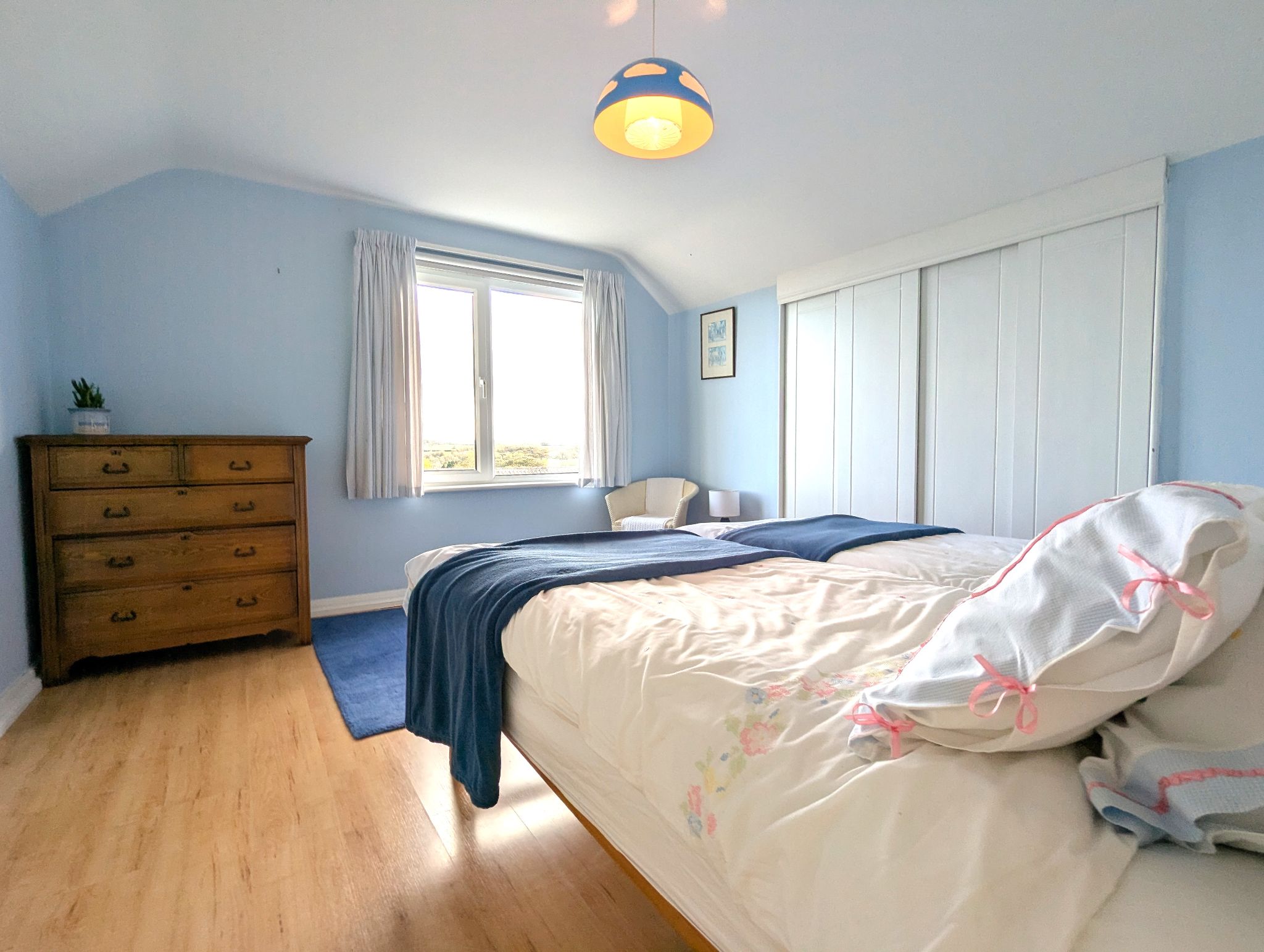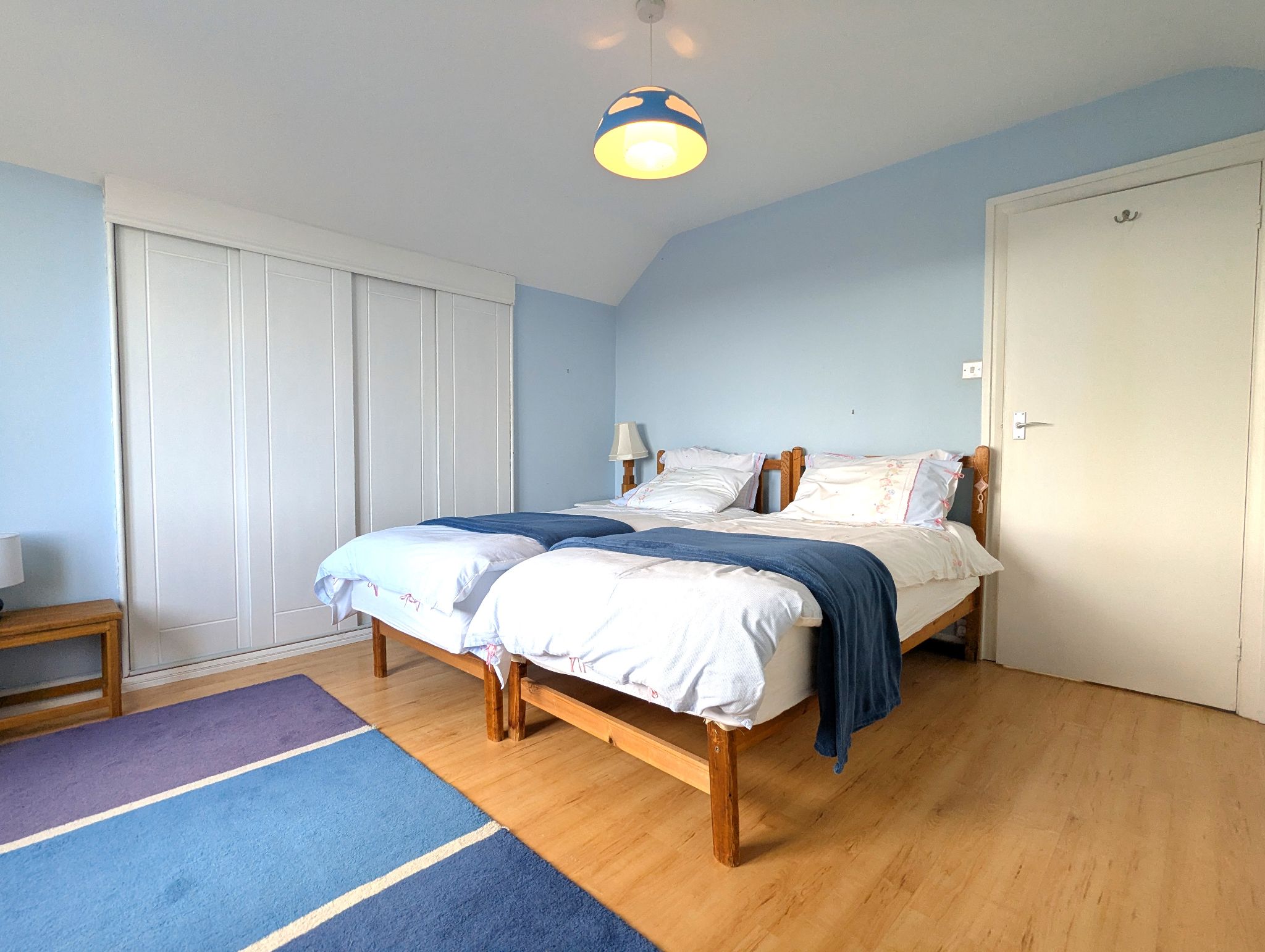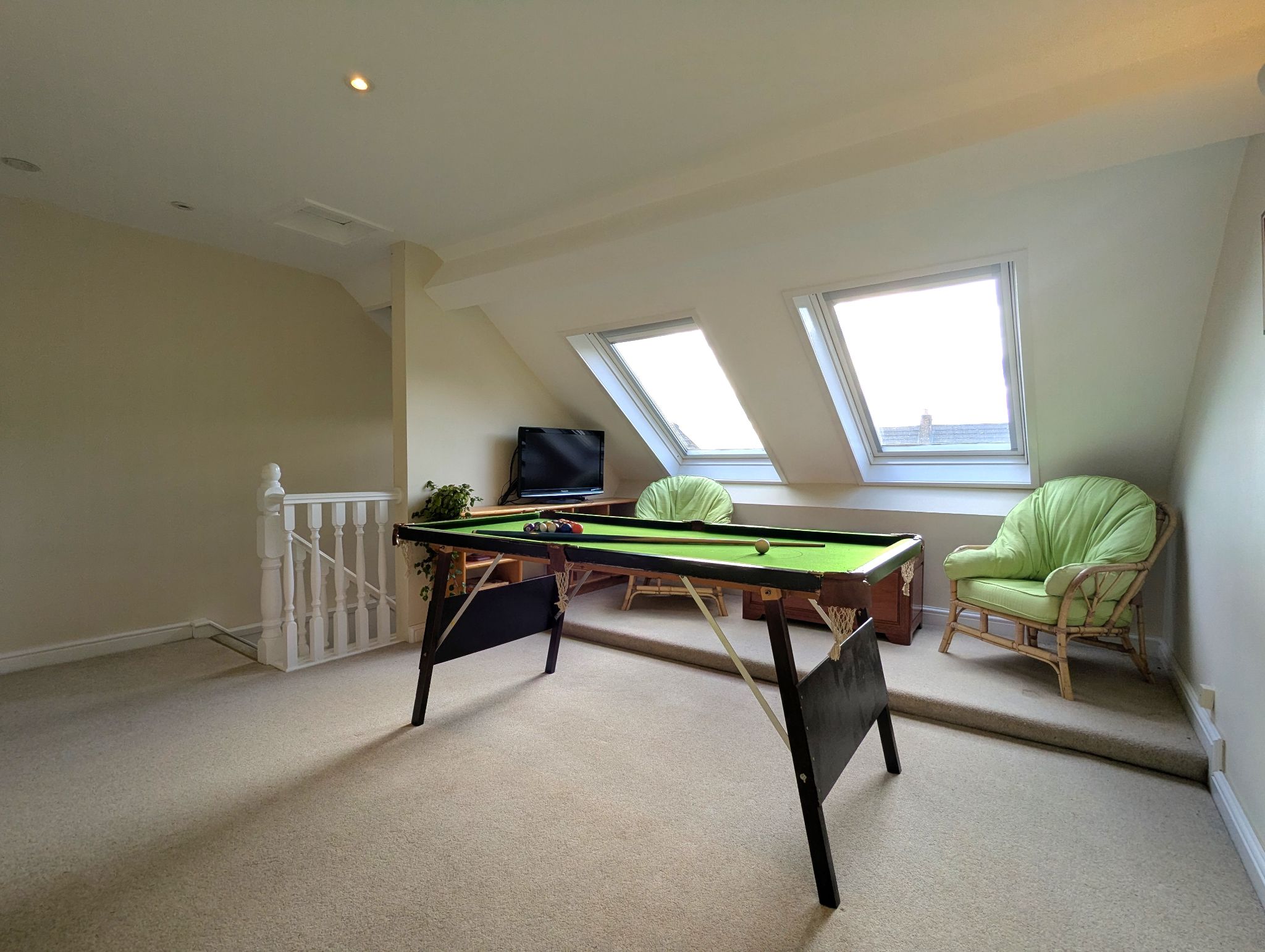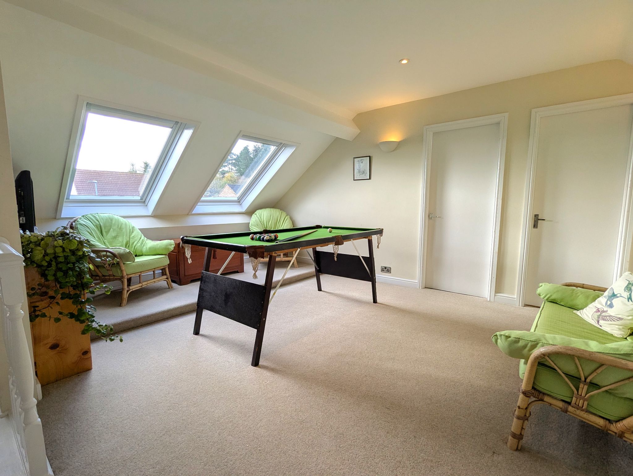 First Floor Reception Area 14’5 x 15’4 (4.45m x 4.72m) Make your way up the stairs from the hall to arrive at a spacious carpeted reception area which fills with natural light thanks to 3 large front-facing Velux skylights with fitted blinds. Offering access to 2 additional bedrooms, a shower room and storage in the eaves which spans almost the full width of the house and accommodates for a boiler and consumer unit for the solar panels.