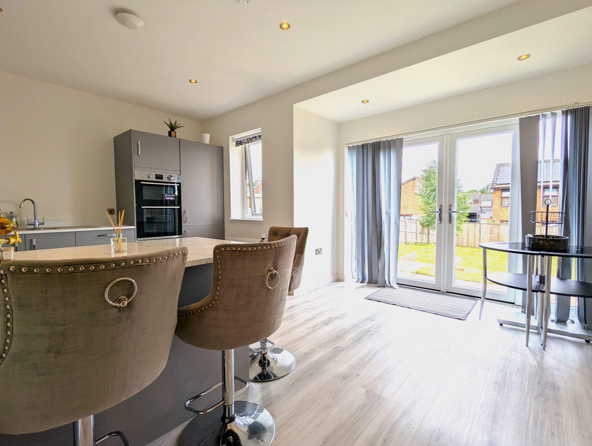 Kitchen/Diner 15'1 x 16'5 (4.60m x 5.02m) - Uniquely designed kitchen/diner with laminate flooring throughout. Ample range of fitted base and wall kitchen units with downlighting and contrasting work surfaces including a breakfast bar. Integrated appliances include a twin electric oven, gas hob with a stainless steel splashback and overhead extractor, dishwasher and fridge/freezer. Stainless steel sink with mixer tap. Rear-facing UPVC double glazed window and separate UPVC double patio doors looking out onto the rear garden. 2 wall mounted radiators and access to the utility.