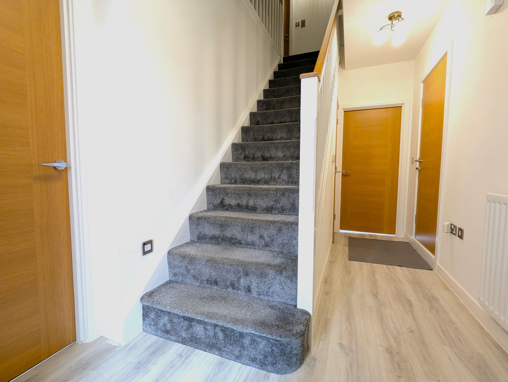 Entrance Hall - Enter via a composite front door into a long entrance hall with laminate flooring with access to a lounge, kitchen/diner, carpeted staircase to the first floor, under stairs cupboard and garage. Wall mounted radiator.
