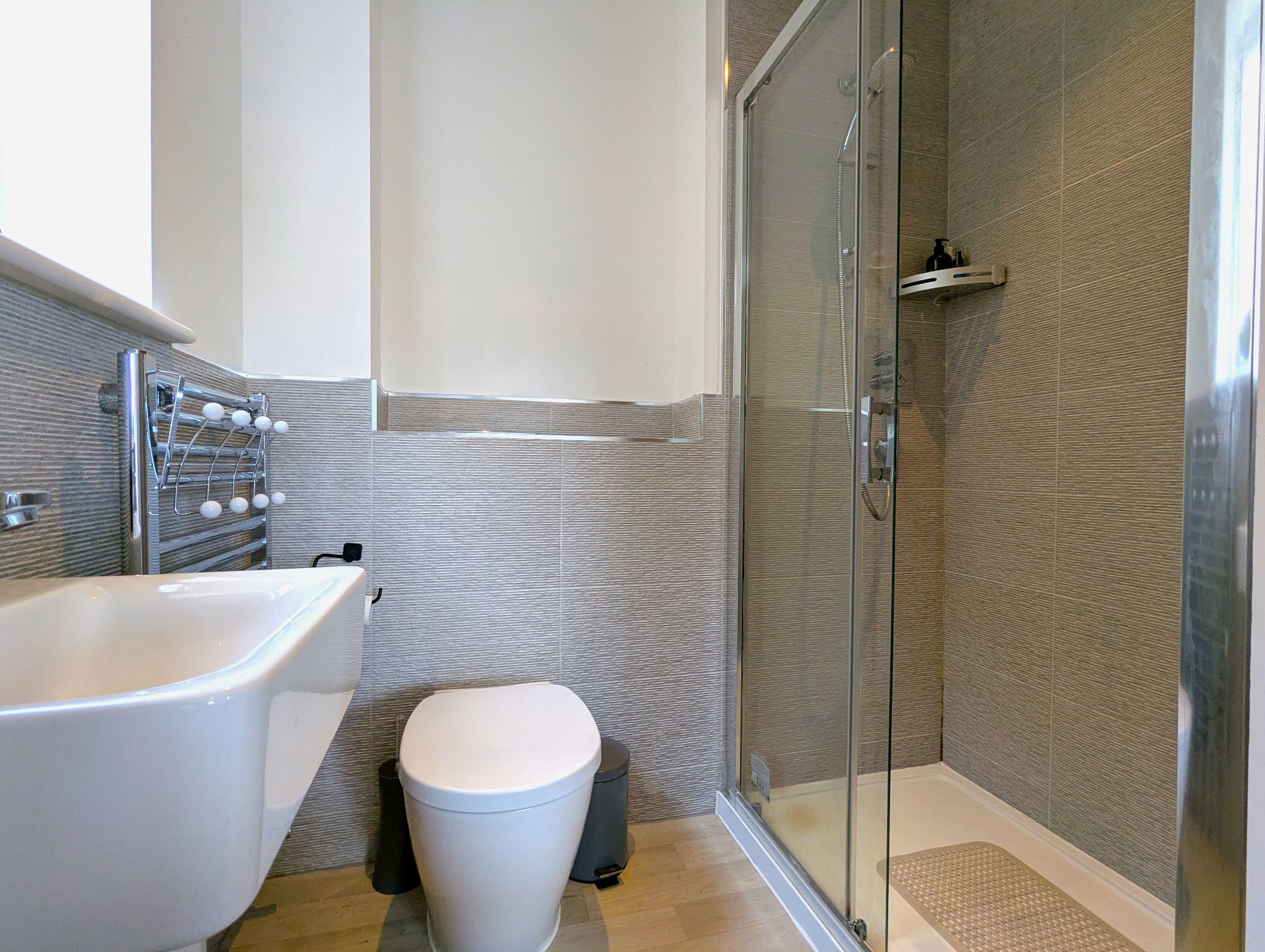 Ensuite 4'8 x 5'7 (1.46m x 1.73m) Vinyl flooring and tiled splashback, access to a toilet, wash basin and shower cubicle with a mains supplied mixer shower. Side-facing UPVC double glazed window, wall mounted heated towel rail and extractor fan.