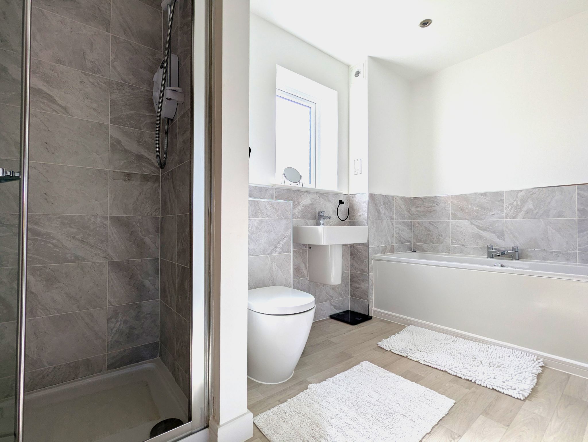 Family Bathroom 5'9 x 11'1 (1.79m x 3.38m) - Vinyl flooring and a tiled splashback. Access to a toilet, wash basin, bath and separate shower cubicle with an electric shower. Rear-facing UPVC double glazed window, wall mounted heated towel rail and extractor fan.