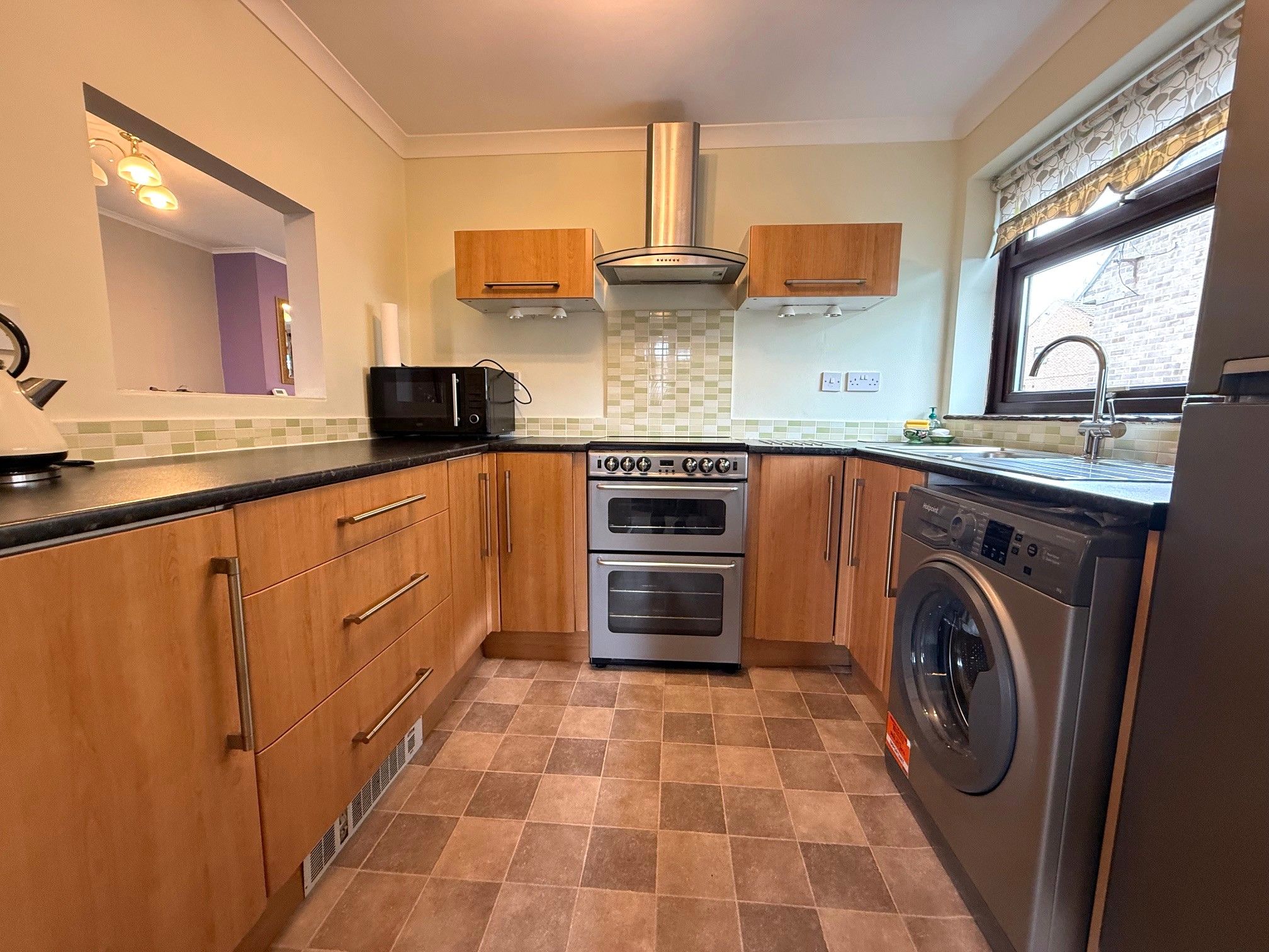 Kitchen. 7'7 x 7'4 (2.32m x 2.23m) Double glazed window to side, wide range of wall and base units, space for a free standing gas oven, plumbed for washing machine, space for fridge freezer, stainless steel sink and drainer, mixer tap, tiled splash backs and a Baxi combination boiler.