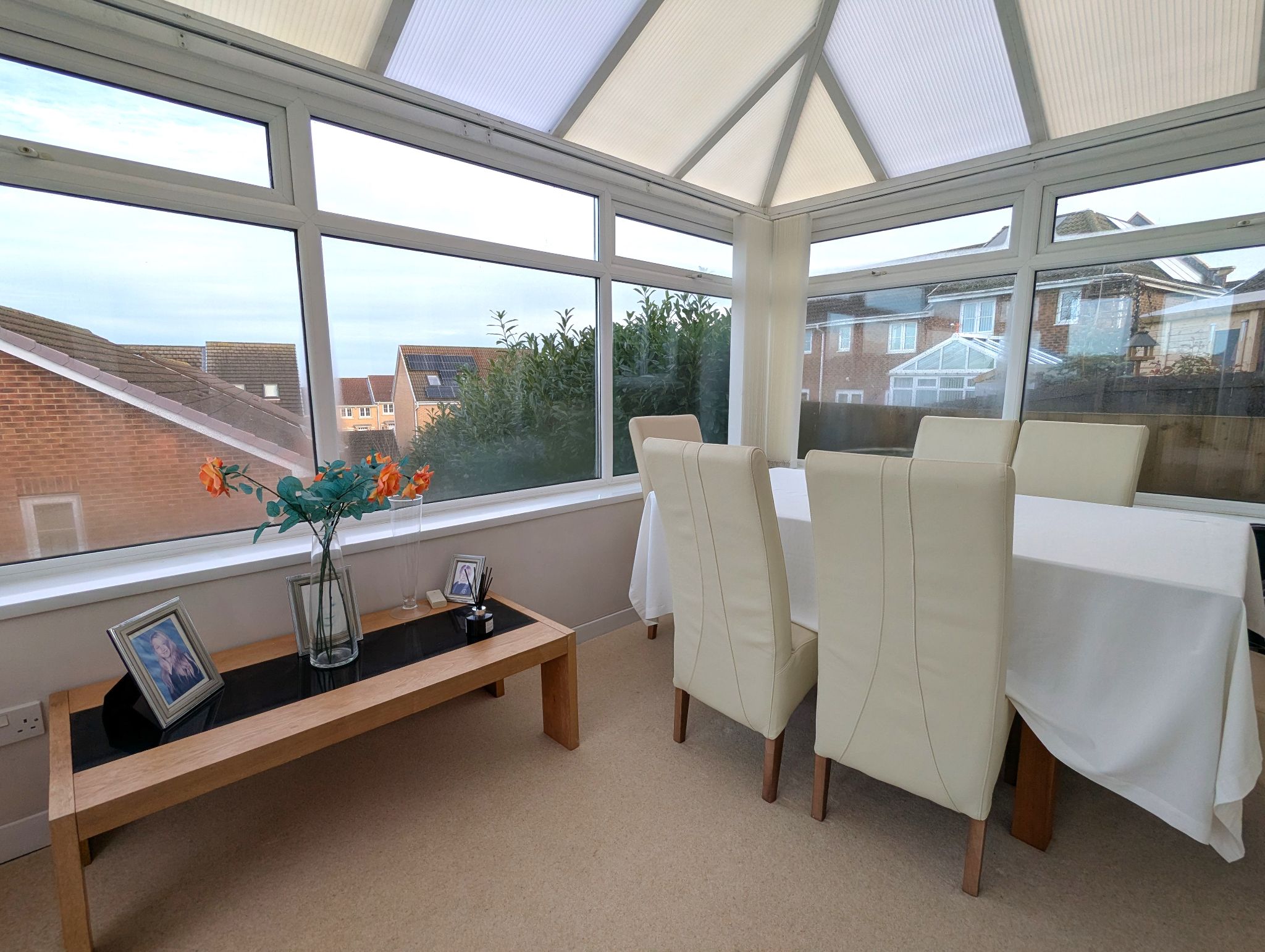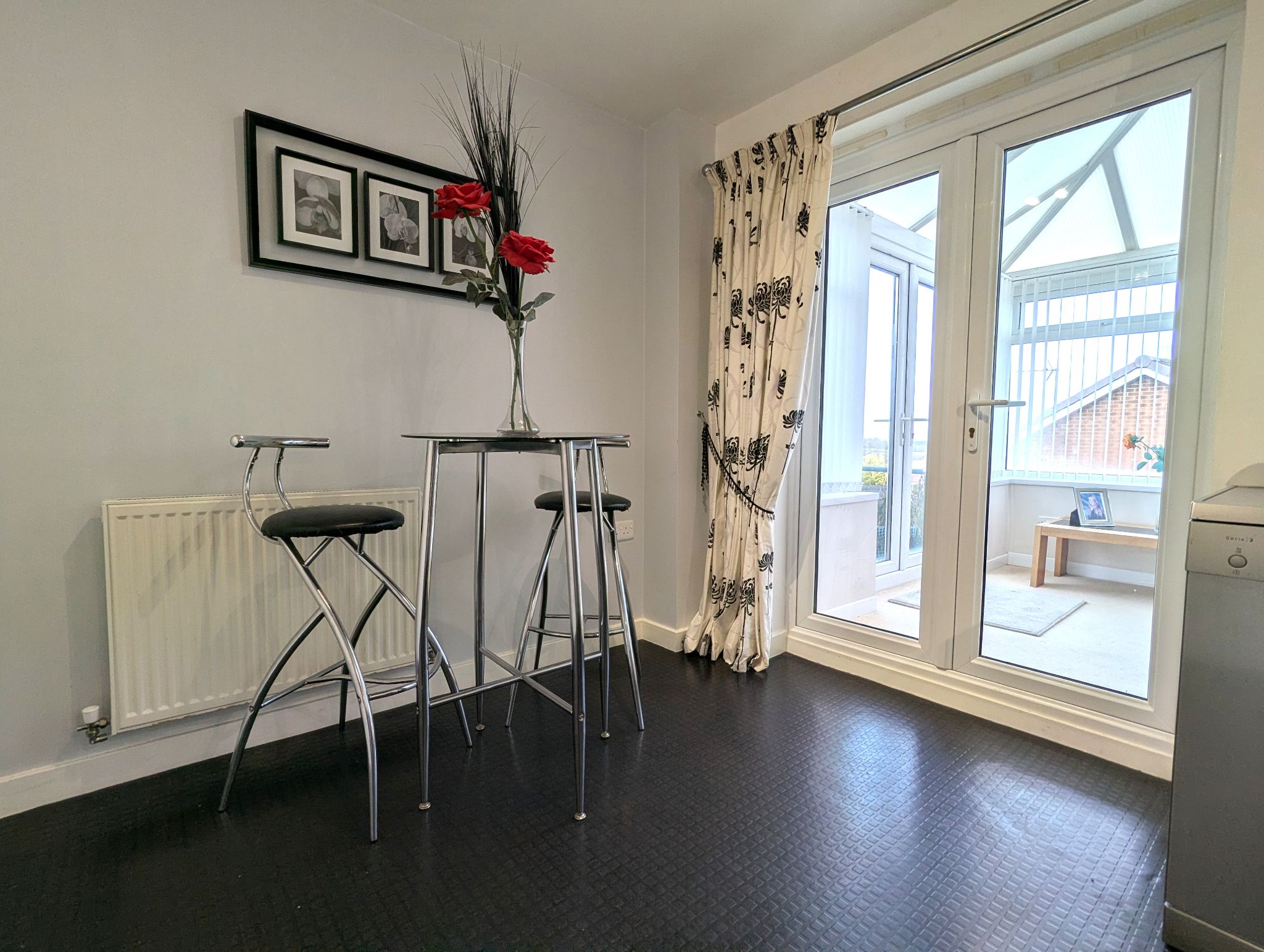 Kitchen/Diner - 8'3 x 15' (2.53m x 4.58m) - Vinyl flooring, access to a range of base and wall fitted kitchen units with contrasting work surfaces. Integrated electric oven and hob with stainless steel splashback and overhead extractor. Space for a washing machine, dishwasher and fridge/freezer. Stainless steel sink with mixer tap below a rear-facing UPVC double glazed window. Double UPVC patio doors for access to the conservatory. Under stairs cupboard and wall mounted radiator.