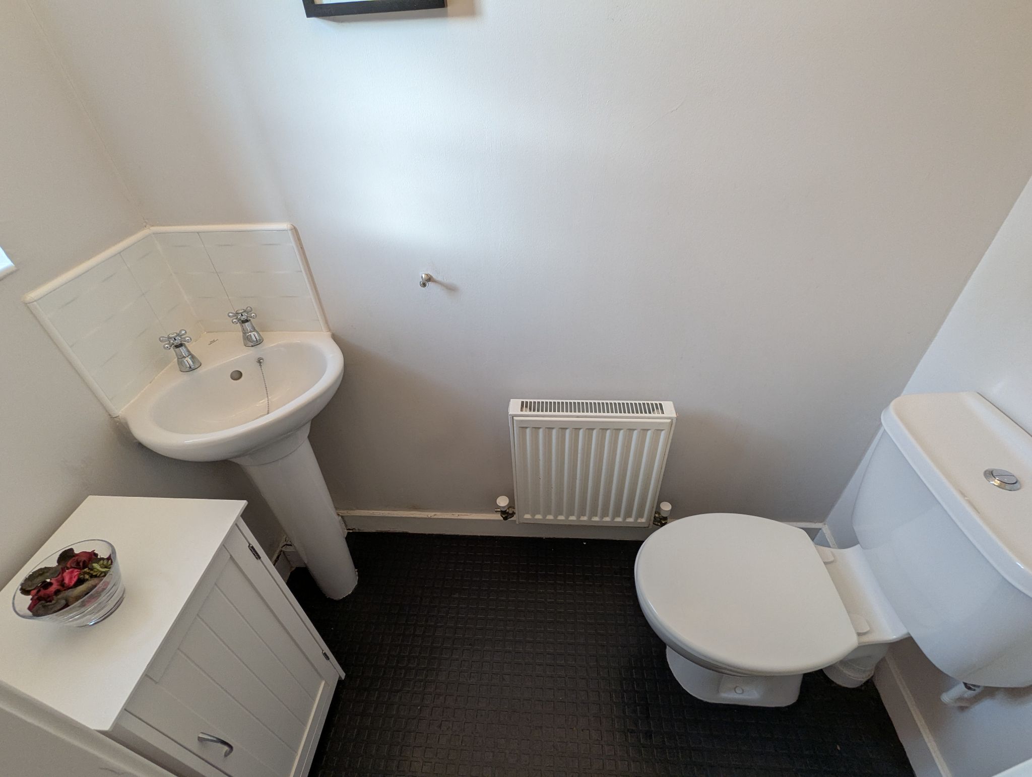 WC - 5'6 x 2'7 (1.72m x 0.85m) - Vinyl flooring, access to a toilet and wash basin, front-facing UPVC double glazed window and wall mounted radiator.