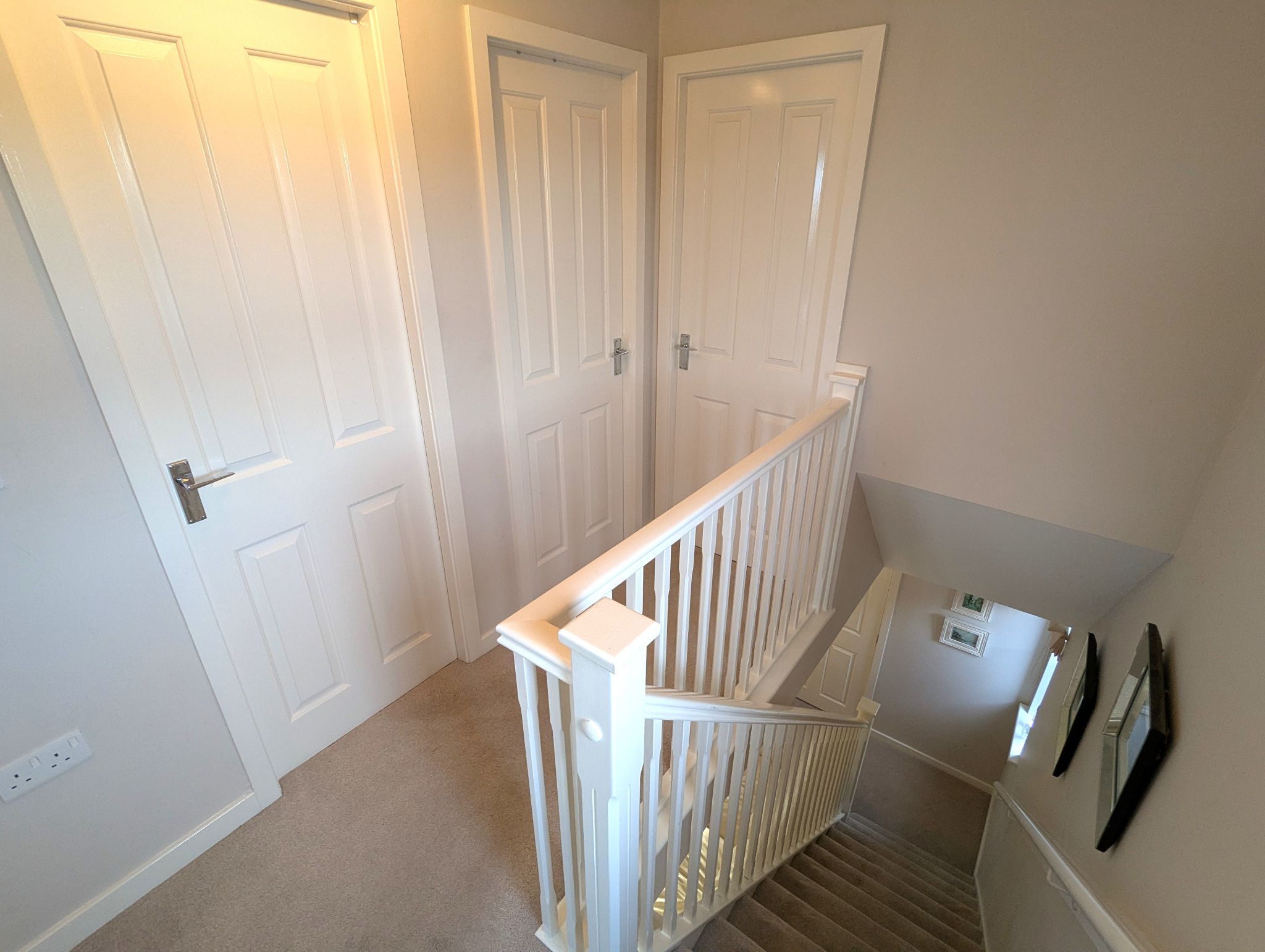 First Floor Landing - Carpeted landing with a side-facing UPVC double glazed window. Access to 3 bedrooms, a bathroom and loft hatch with drop down ladder leading to a fully boarded loft space with lighting.