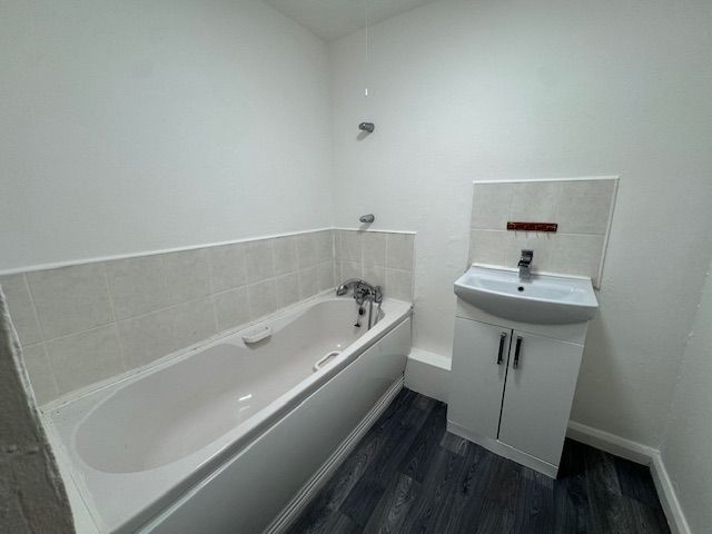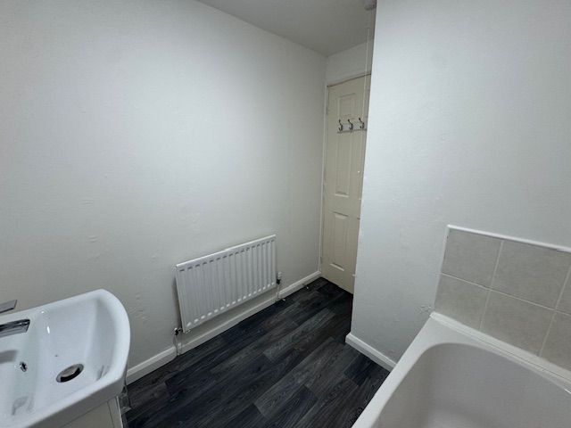 Family bathroom - 1.96 x 2.31 - WC to the room to the left, wash hand basin unit, bath with shower powered by mains, tiled surround, single panel radiator, pendant light fitting and vinyl flooring.
