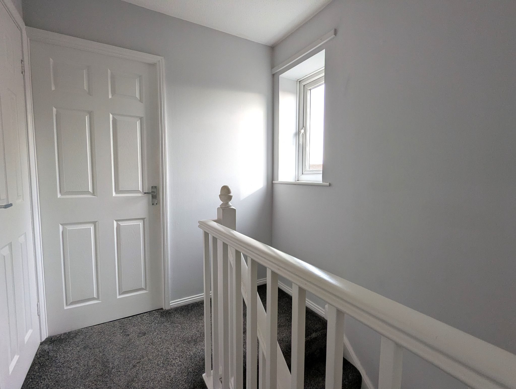 First Floor Landing - Carpeted landing with a side-facing UPVC double glazed window. Access to 2 spacious bedrooms, bathroom, built-in cupboard and loft hatch.