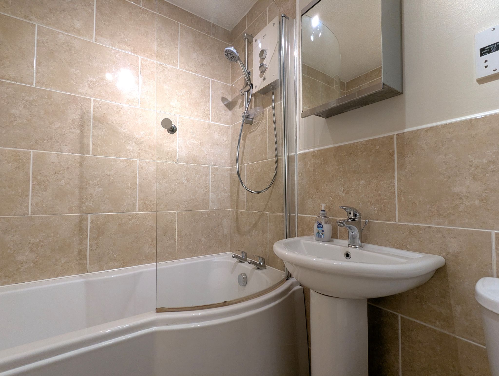Bathroom - 5'7 x 7' (1.75m x 2.14m) - Tiled flooring and splashback. Access to a toilet, wash basin and 'P' shaped bath with an electric shower over. Heated towel rail and extractor fan.