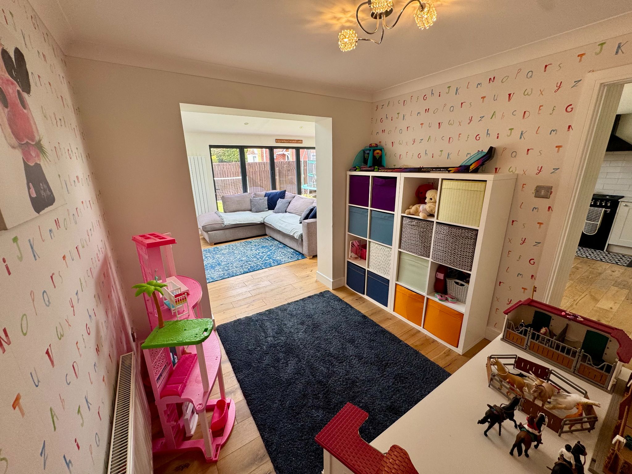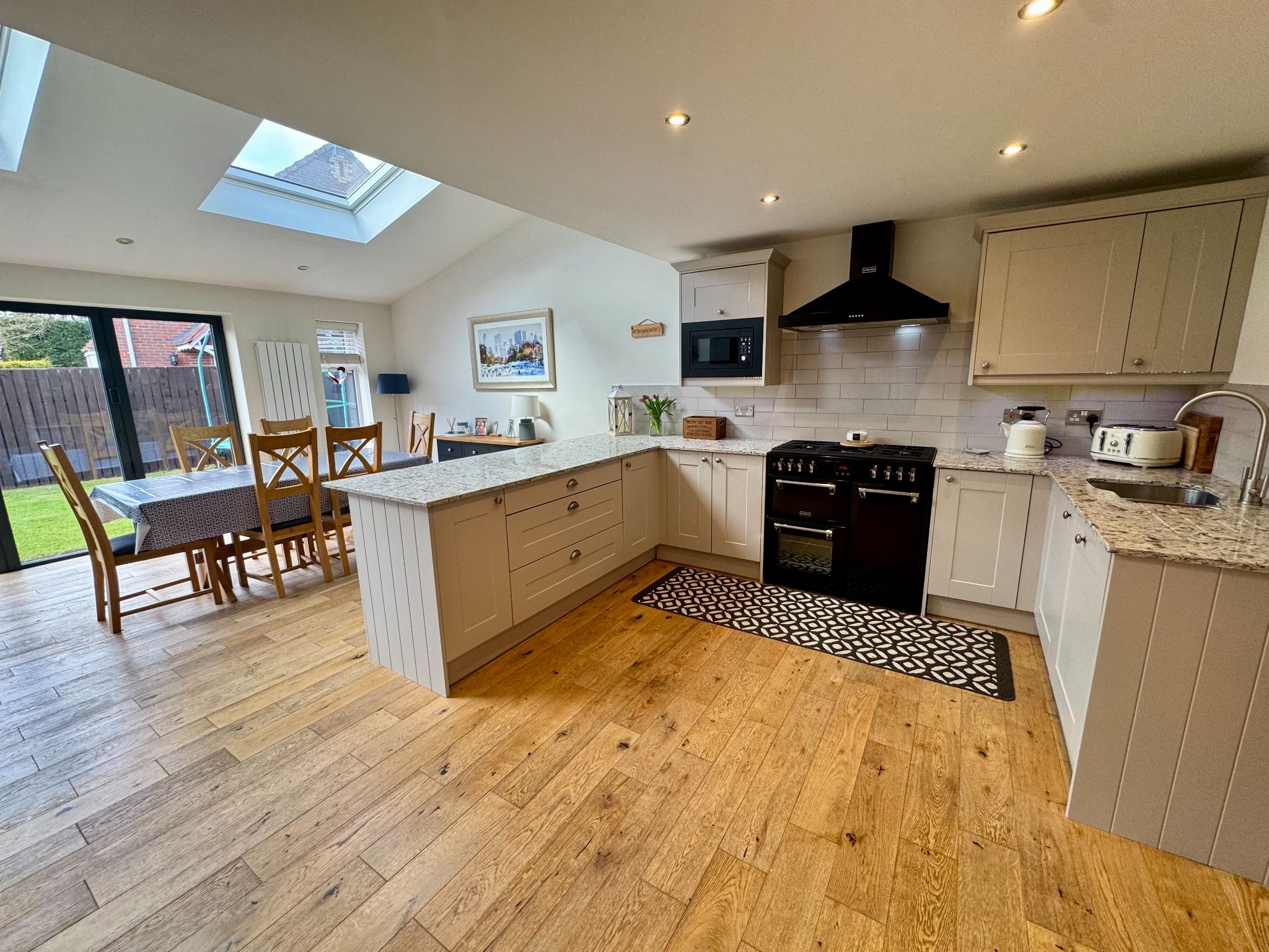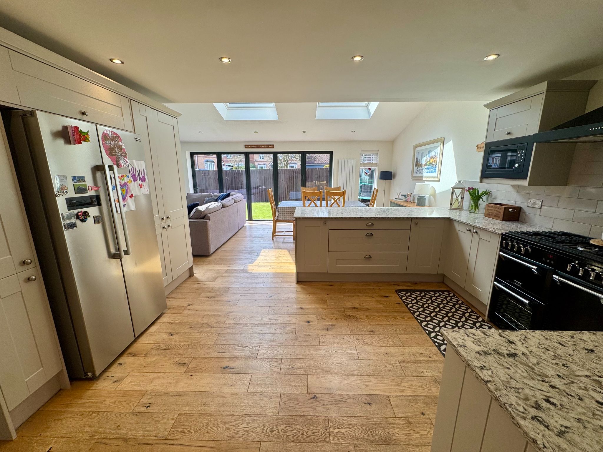 Inside, the home offers three reception areas, the lifestyle area of the property is the superb open plan, luxurious kitchen area to the rear. With quartz worktops, range oven sits looking over the vast rear dining and living room. Velux window's to the ceiling and bi-fold doors face onto the westerly facing rear gardens where an abundance of natural light floods in. A beautiful formal lounge is located from the hallway for relaxing evenings which is set away from the rear. A separate reception area offers an additional reception space that could become a playroom, home office or cosy snug, this layout provides the kind of adaptability that is increasingly hard to find. Solid Oak doors are fitted throughout along with wood flooring through the hallway and rear. The overall feel is one of space and practicality, while still retaining the inviting atmosphere that makes a house feel like home.