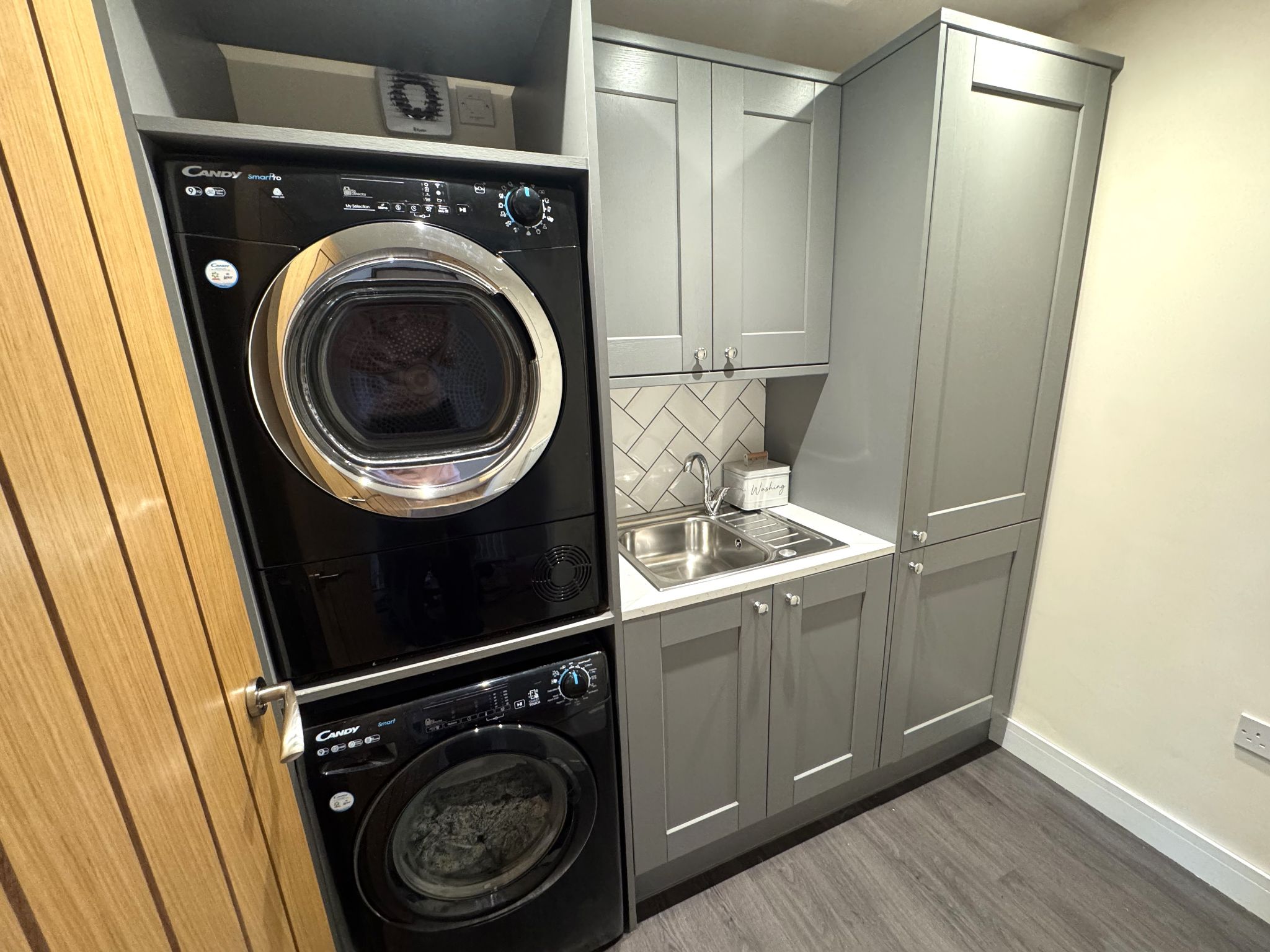 Utility Room. 7'1 x 4'9 (2.15m x 1.45m) With a range of units, stainless steel sink and drainer, mixer tap, plumbed for washing machine, space for tumble dryer, integrated fridge freezer, radiator, spot lights to ceiling and laminate flooring.