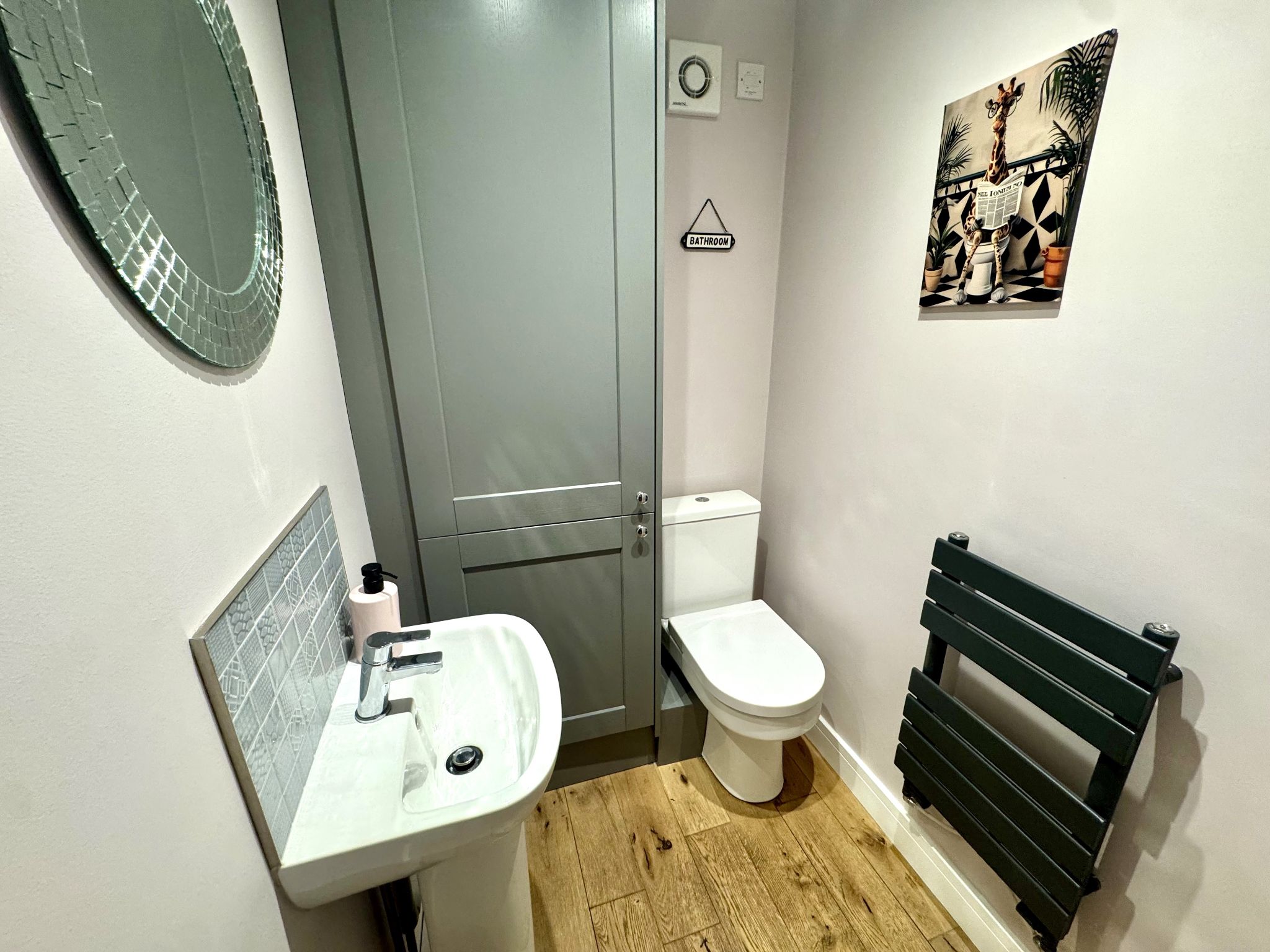Ground Floor WC. 5' x 4'4 (1.51m x 1.31m) Wc, hand basin, storage cupboard with Potterton combination boiler.