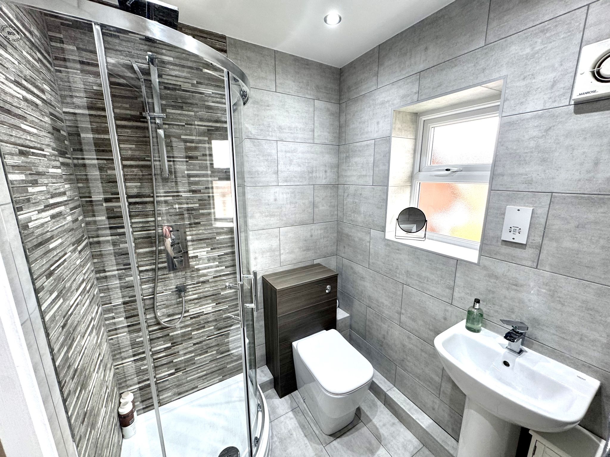 En-Suite. 5'9 x 5'3 (1.76m x 1.61m) Double glazed window to front, shower enclosure with twin heads, WC, hand wash basin, fully tiled walls, heated towel rail, spotlights to ceiling, tiled flooring, extractor fan and shaver point.