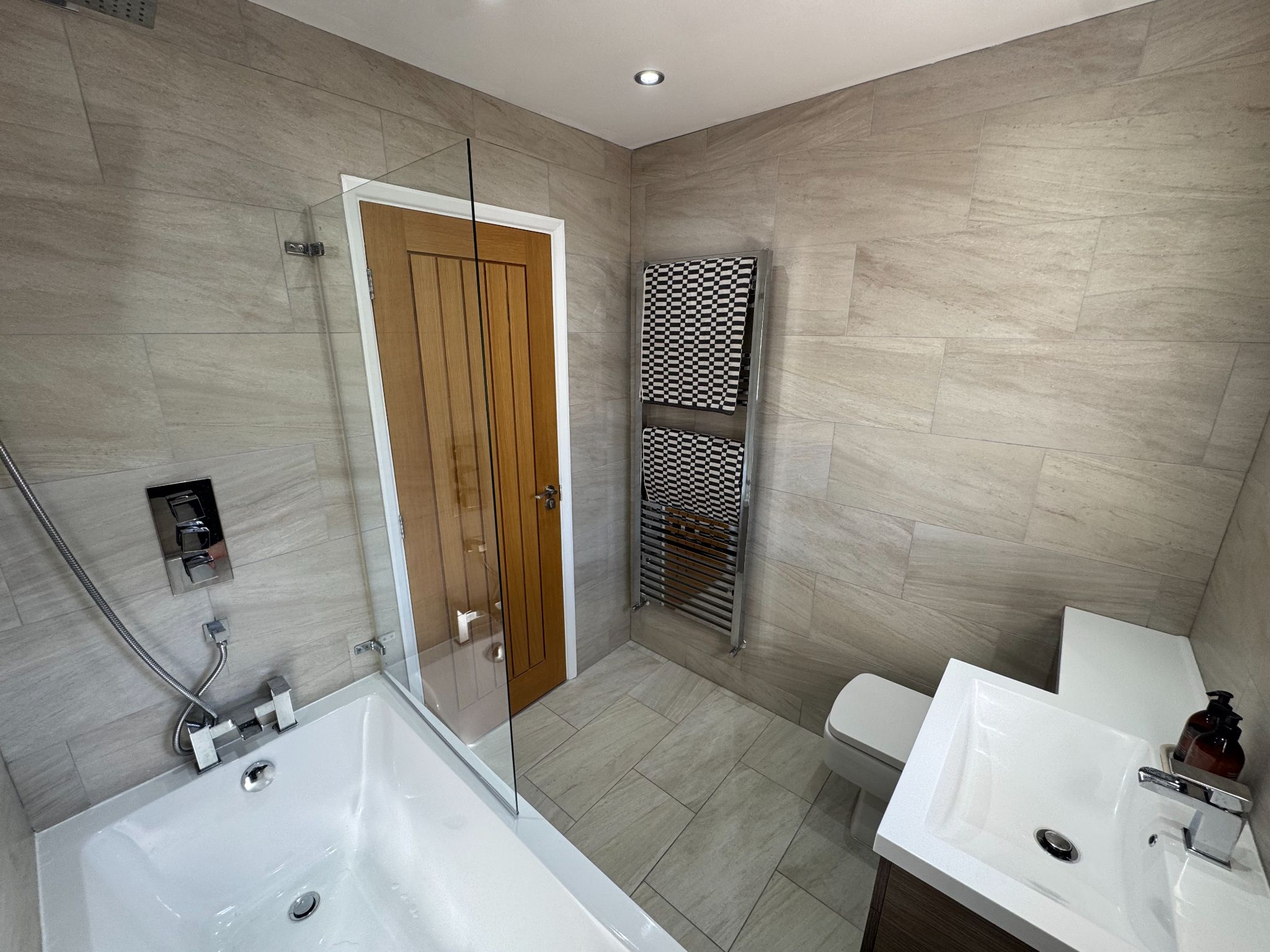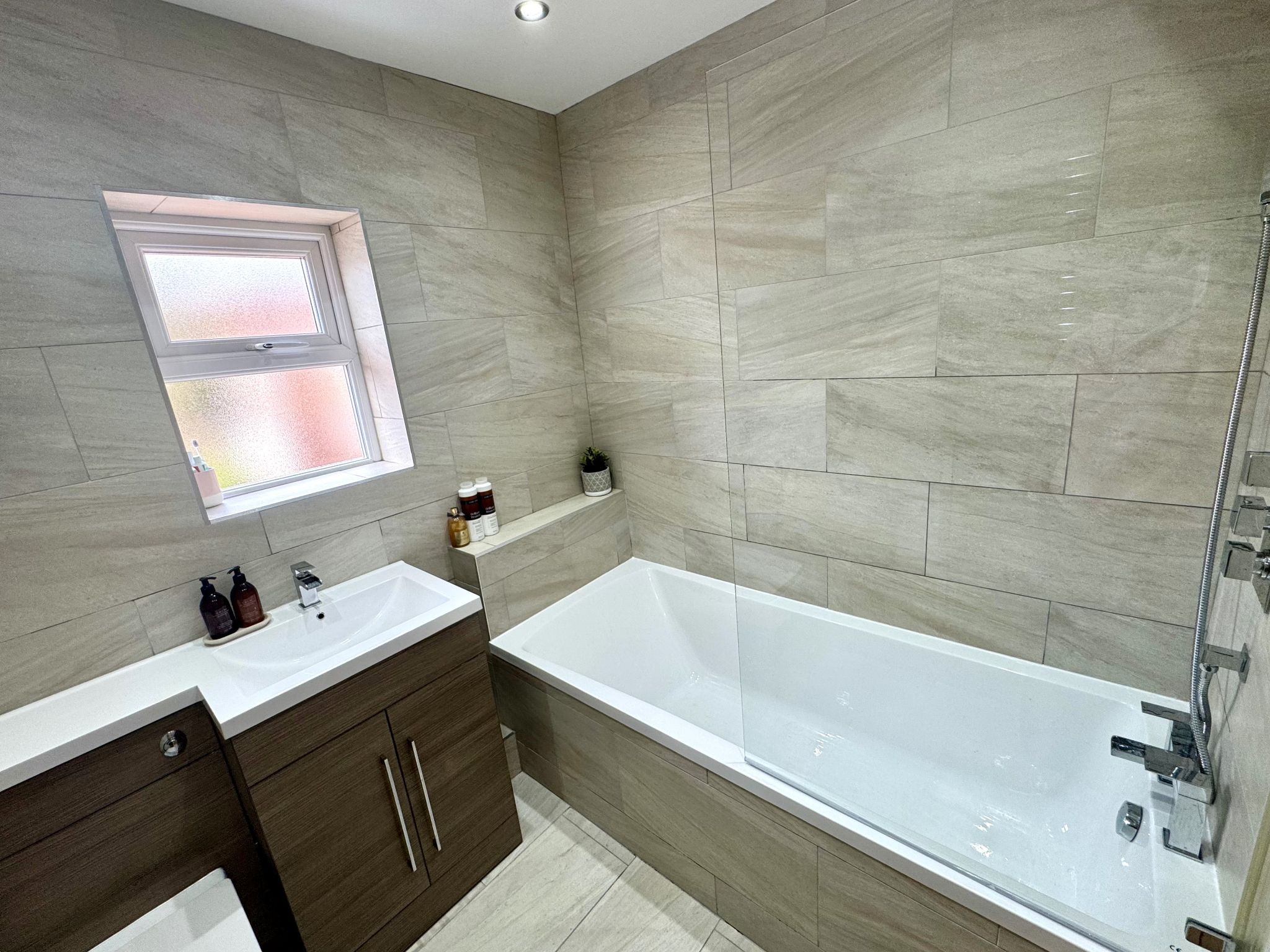 Bathroom. 6'10 x 6'4 (2.08m x 1.92m) Double glazed window to rear, bath, WC and hand basin, fully tiled walls, heated towel rail, spot lights to ceiling, tiled flooring and extractor fan.