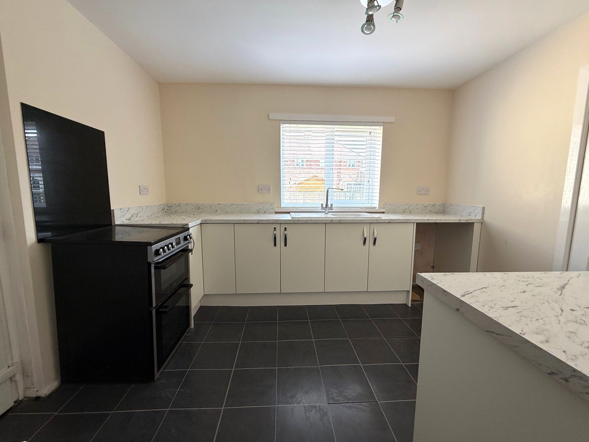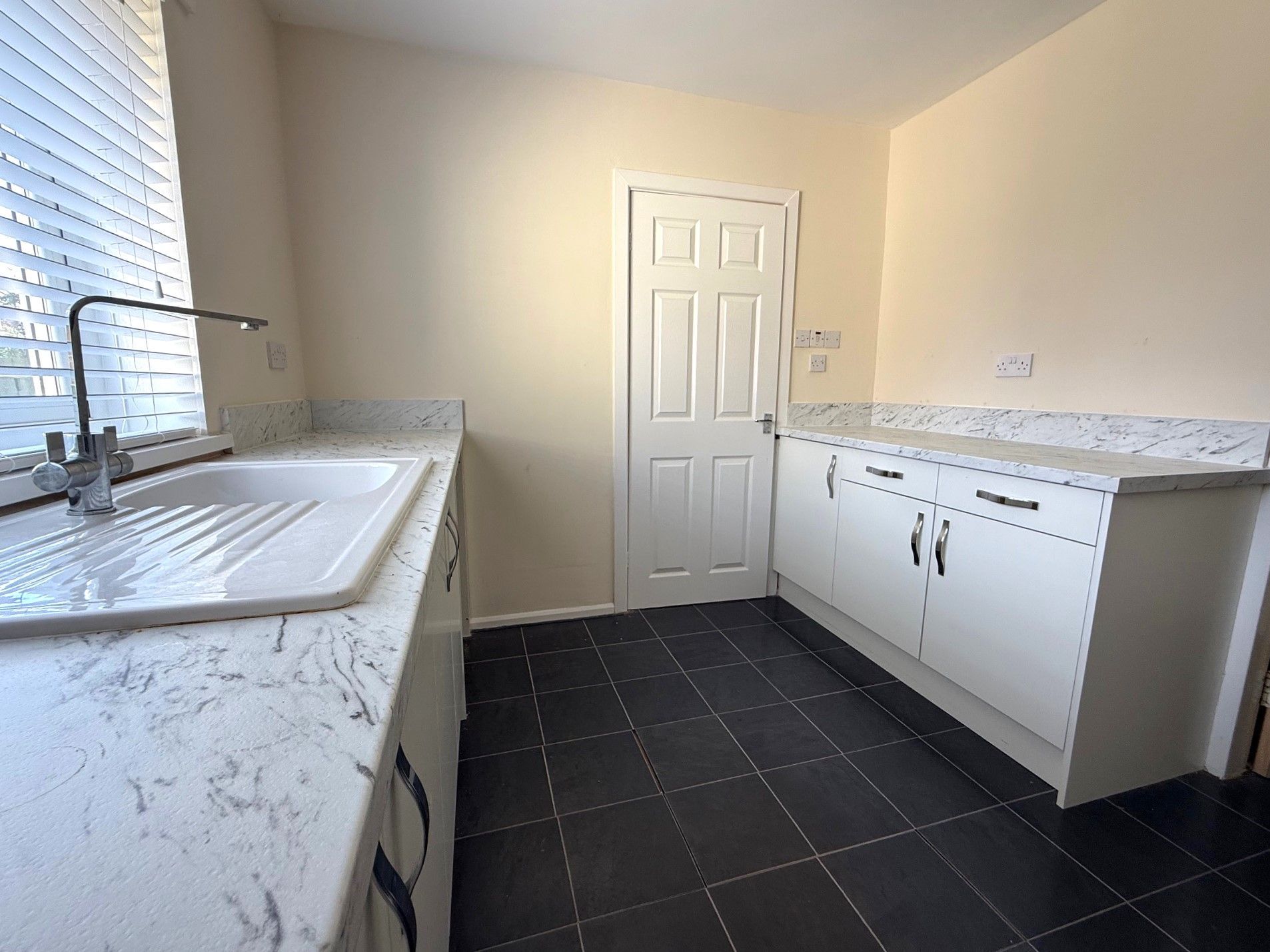 Kitchen. Double glazed window to rear, range of recently installed base units, space for electric oven, plumbed for washing machine, ceramic sink and drainer, mixer tap, radiator and large storage off kitchen.