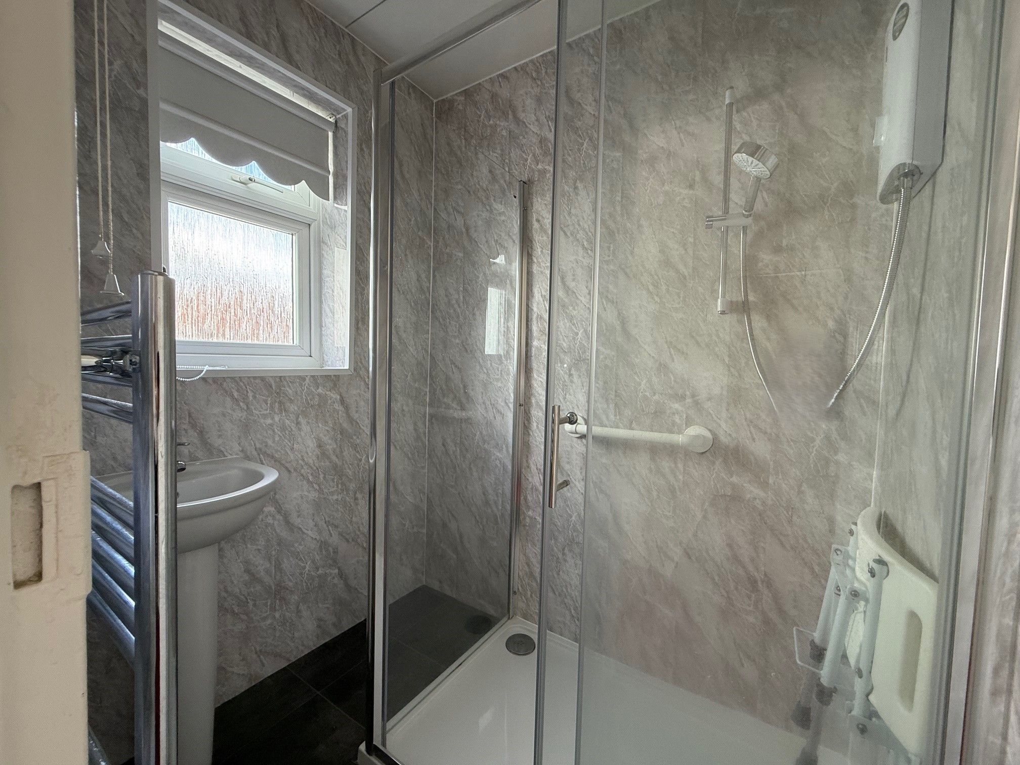 Shower Room. 5'4 x 4'4 (1.63m x 1.33m) Double glazed window to the side, walk in double shower enclosure, electric shower, hand basin, fully cladded walls, heated towel rail and spot lights to ceiling.