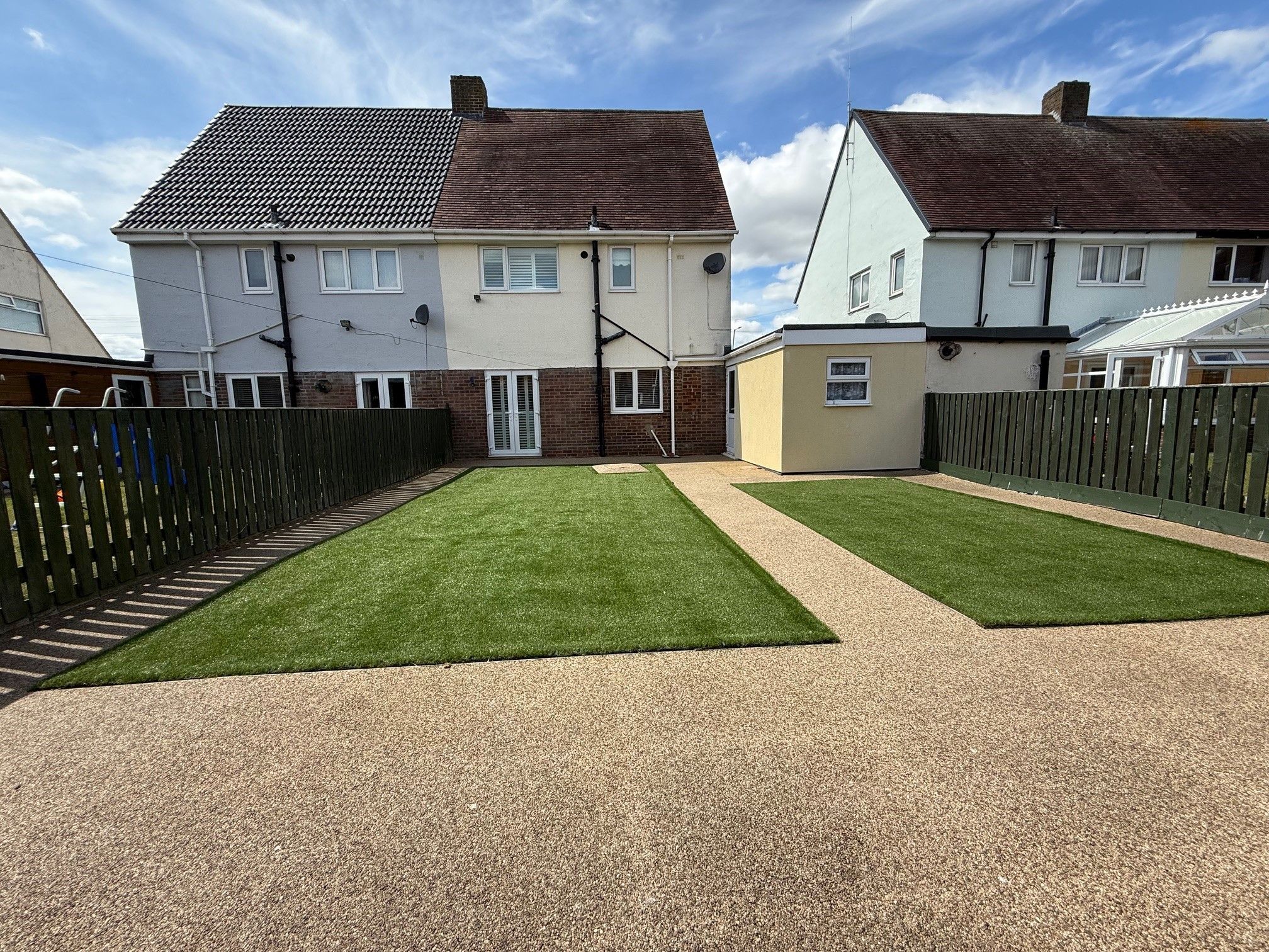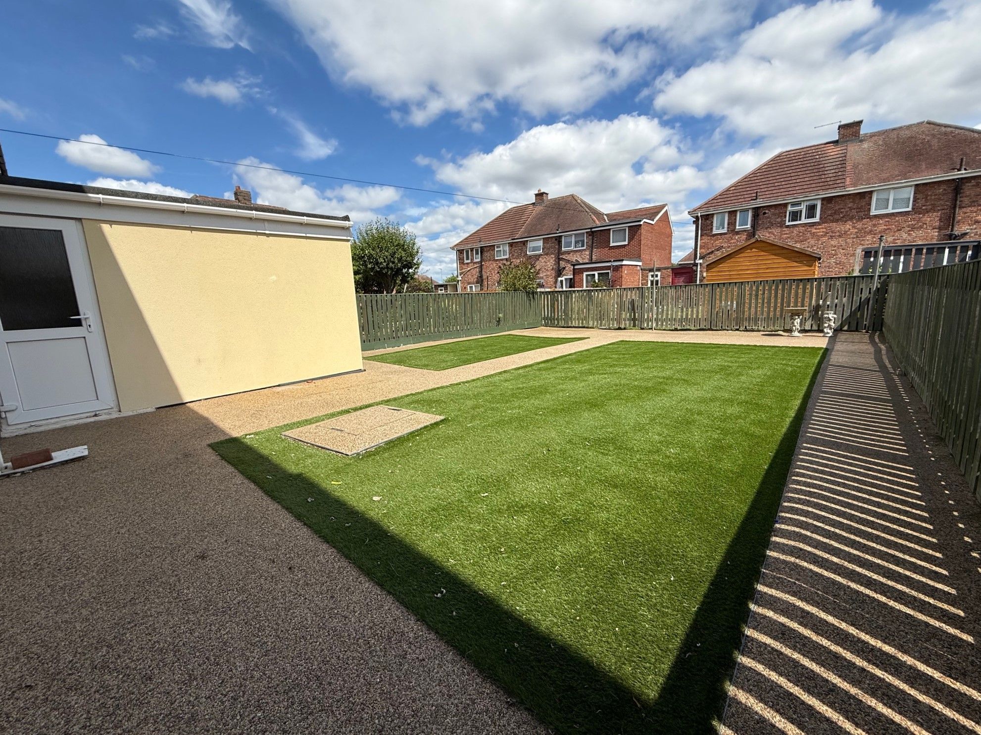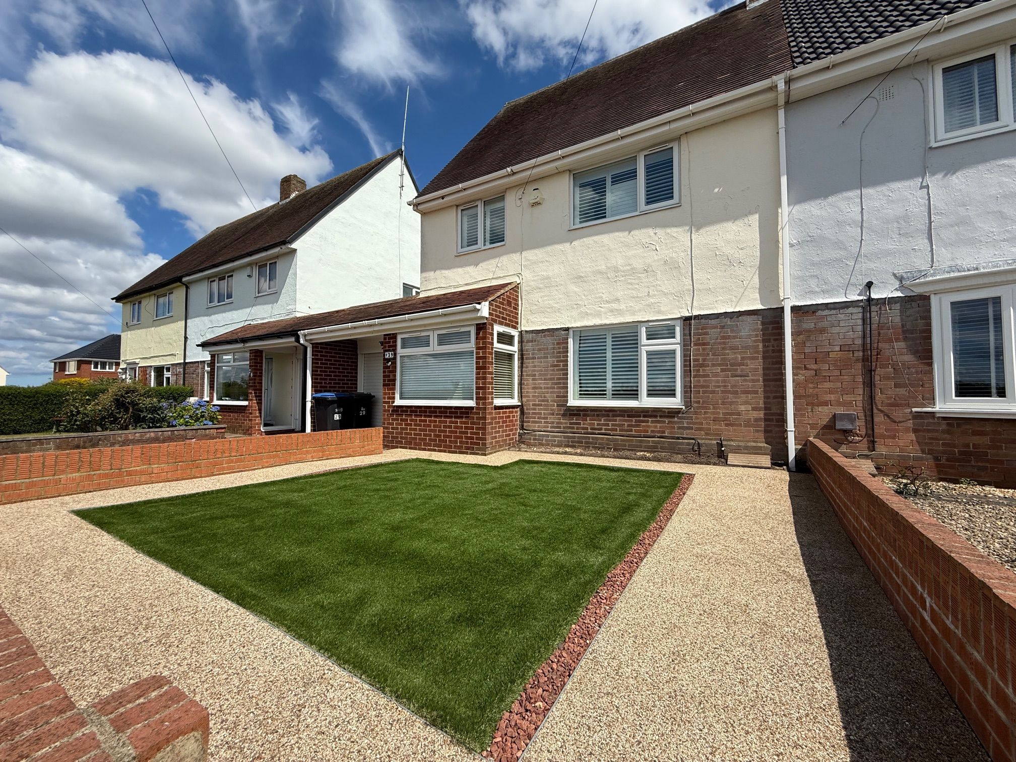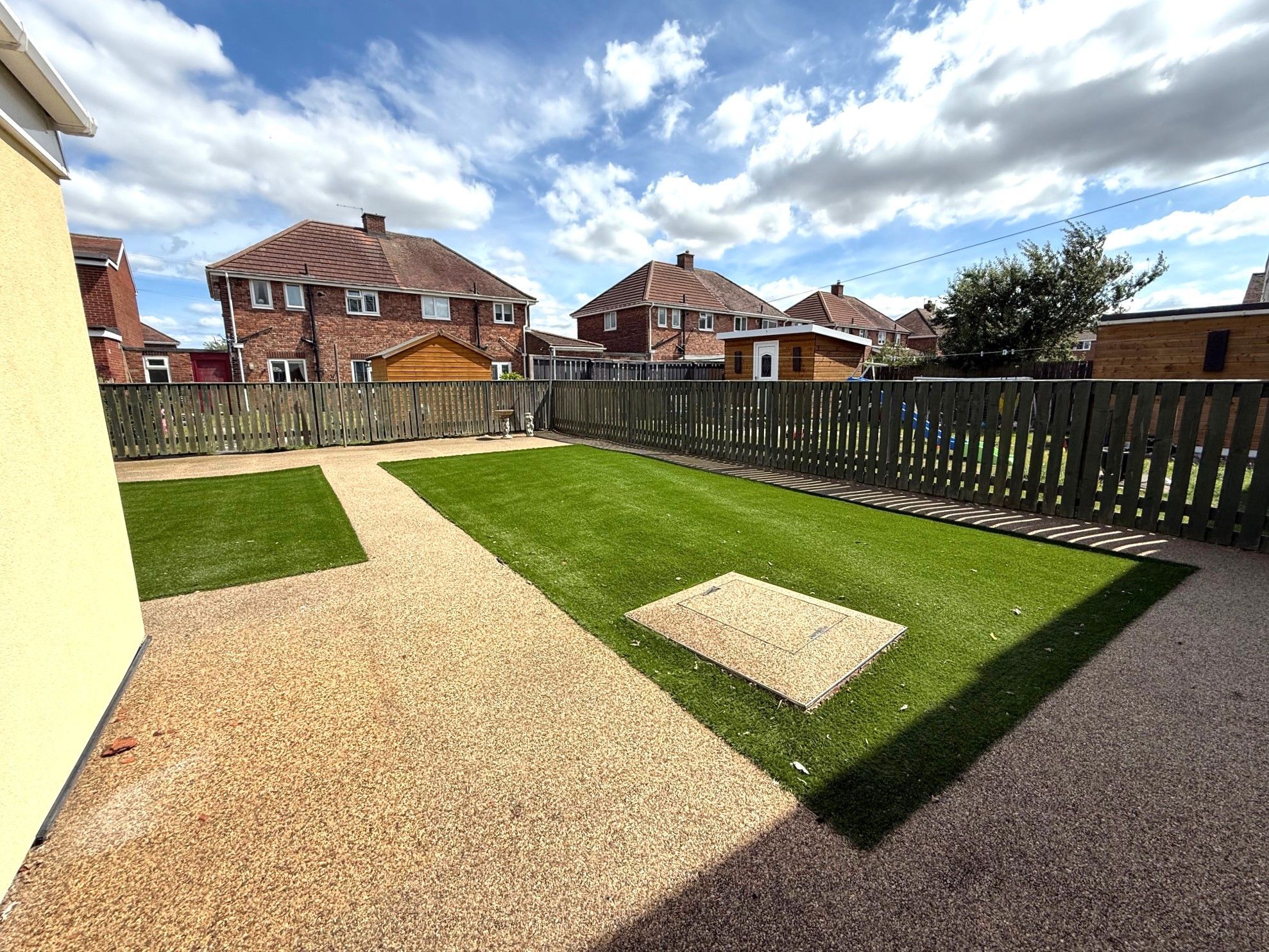 Well maintained gardens are to the front and rear with resin paths and artificial grass. The rear garden is an excellent size , ideal for families.
