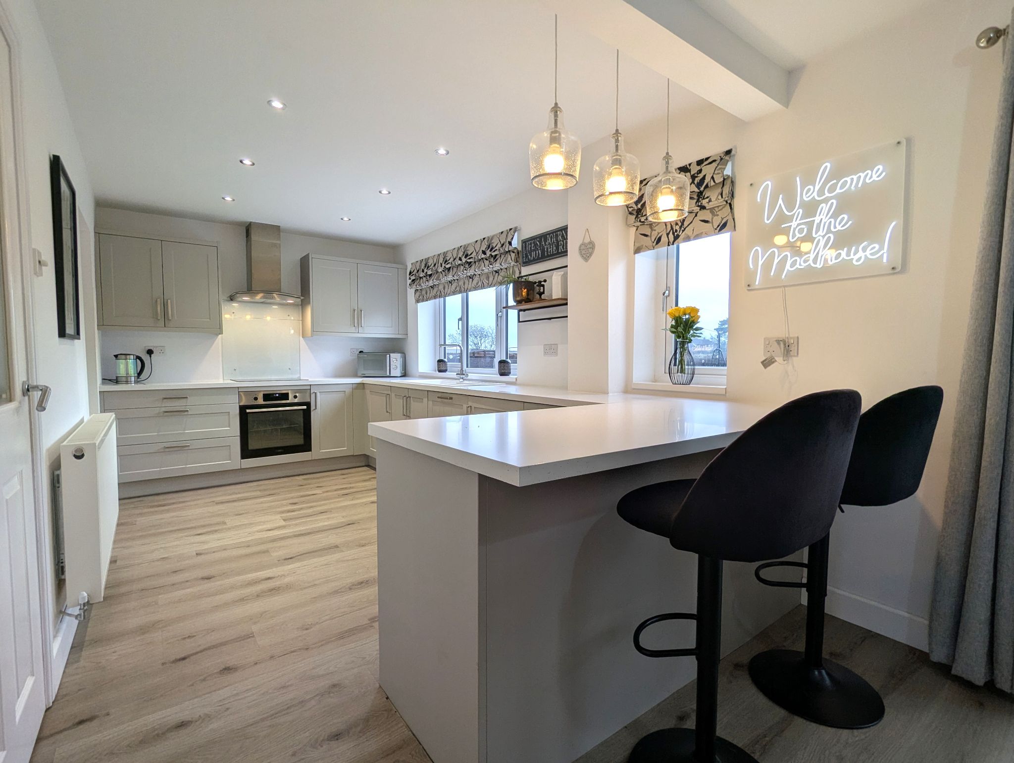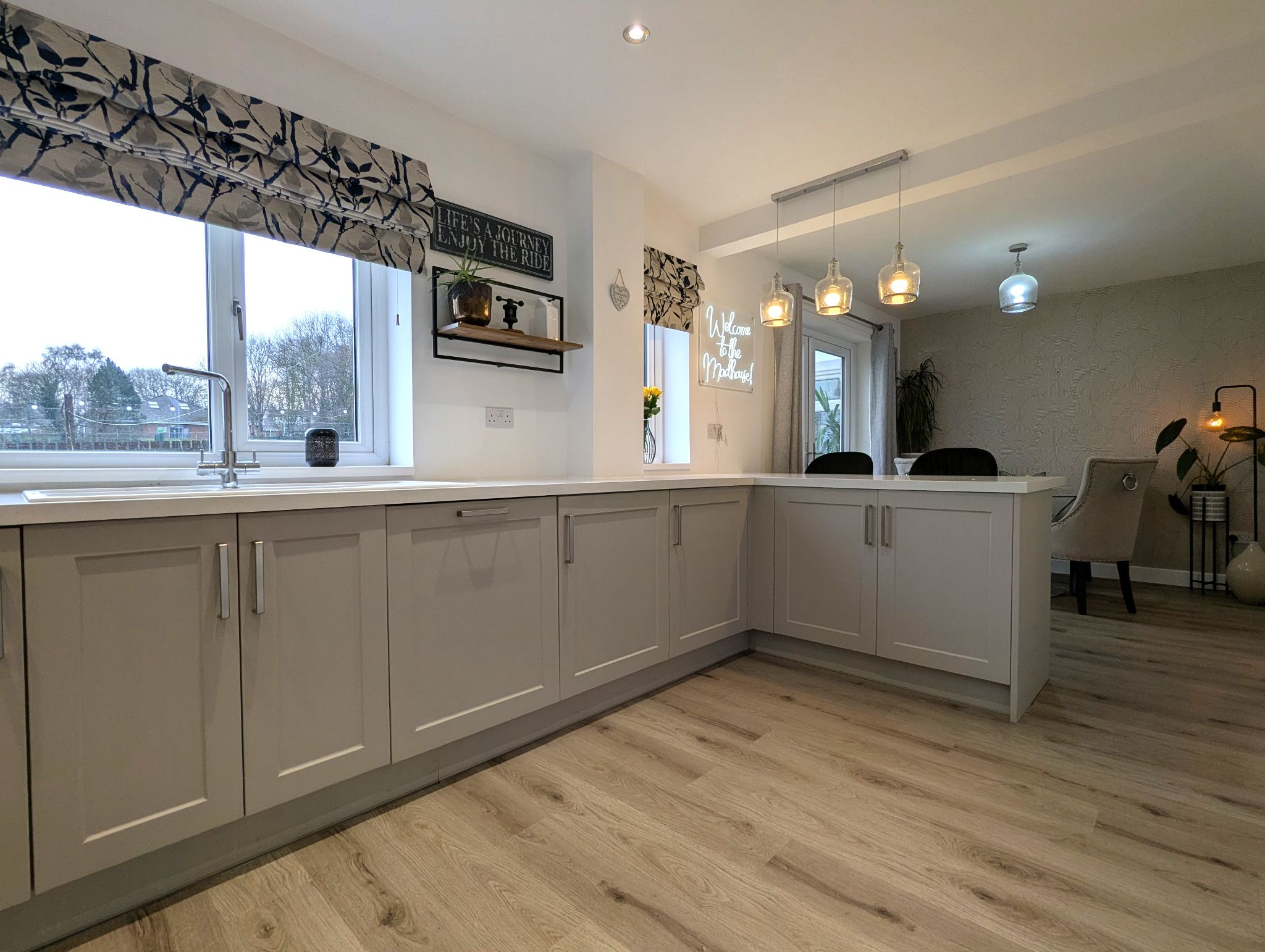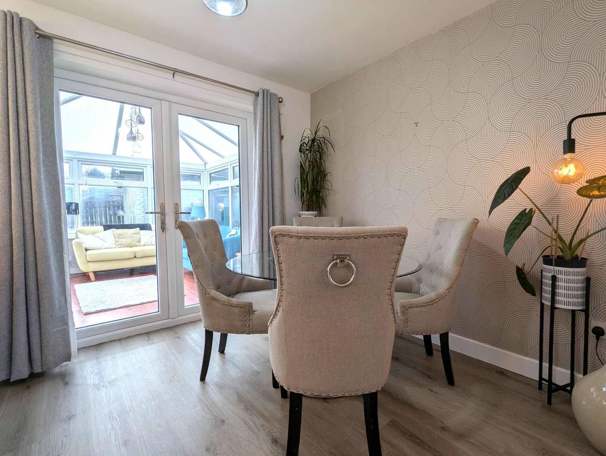 Kitchen/Diner - 8'6 x 24'5 (2.64m x 7.47m) - A spacious kitchen/diner with laminate flooring throughout. Superb modern kitchen with a generous range of fitted storage units and ample work surfaces along with a breakfast bar. Integrated appliances include an electric oven and induction hob with a an overhead extractor and glass splashback as well as a dishwasher. Composite one-and-a-half sink with mixer tap. 2 rear-facing UPVC double glazed windows as well as UPVC double French doors leading to the conservatory.