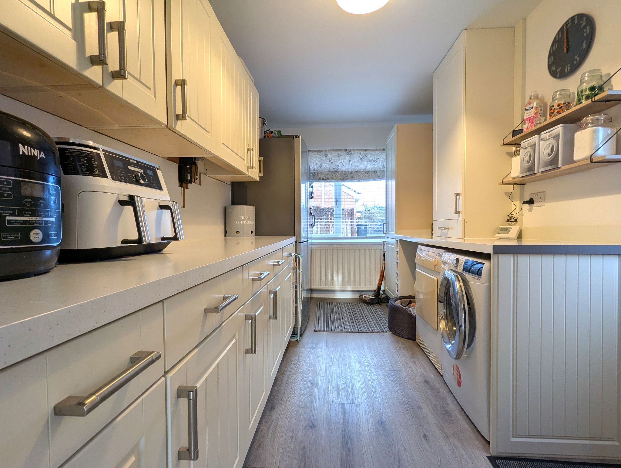 Utility - 15'6 x 7'2 (4.78m x 2.20m) - Impressive Utility room with a generous range of fitted units for additional storage and ample work space. Front-facing UPVC double glazed window. Space for a freestanding washing machine, tumble dryer and fridge/freezer. Enclosed combination boiler. UPVC door leading to the side access for the front and rear exteriors.