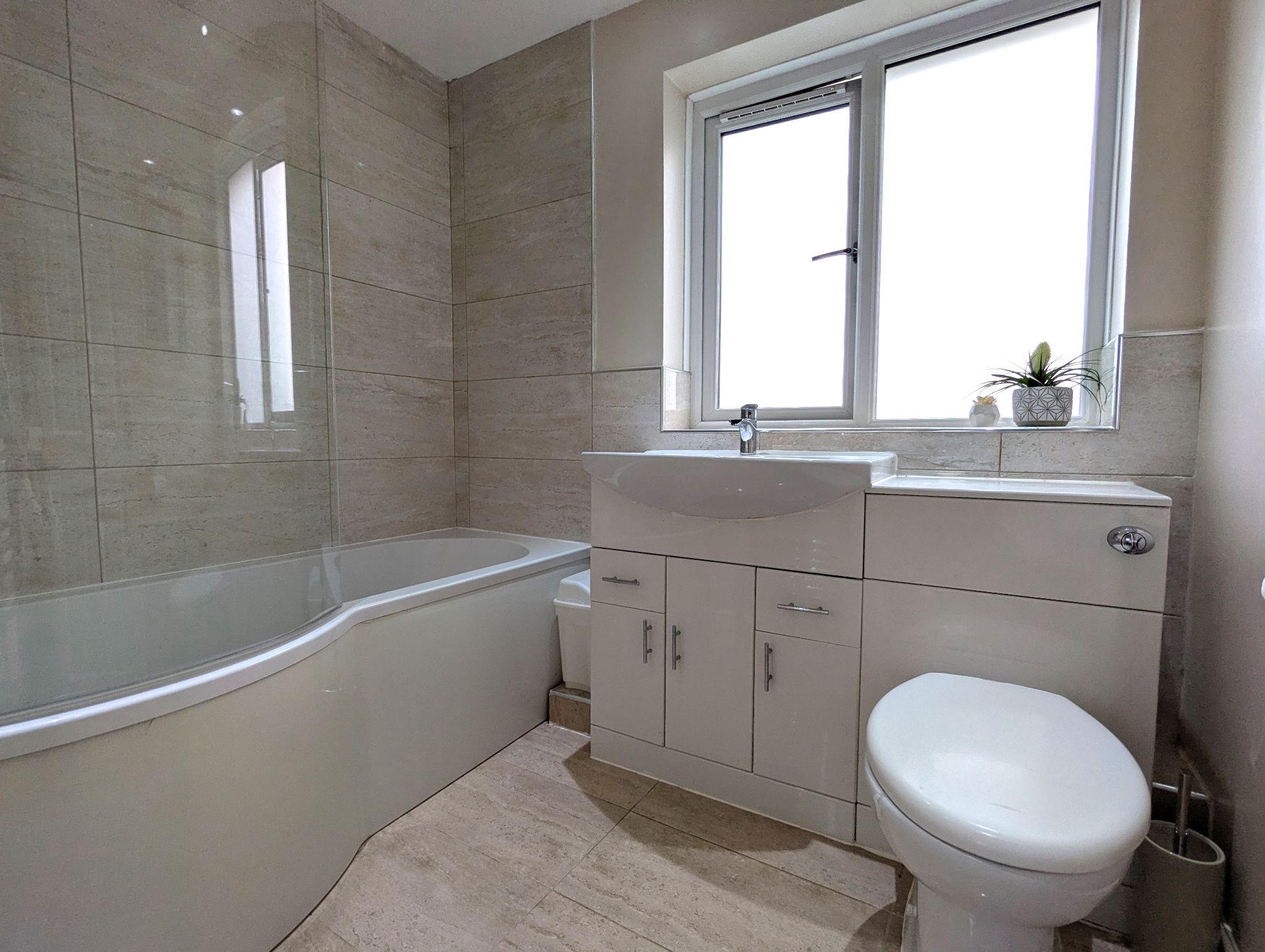 Family Bathroom - 5'5 x 7'3 (1.70m x 2.24m) - Tiled flooring. Access to a toilet, wash basin, fitted storage units and 'P' shaped bath with a mains supplied mixer shower over and full height tiled splashback. Rear-facing UPVC double glazed window. Wall mounted heated towel rail and extractor fan.