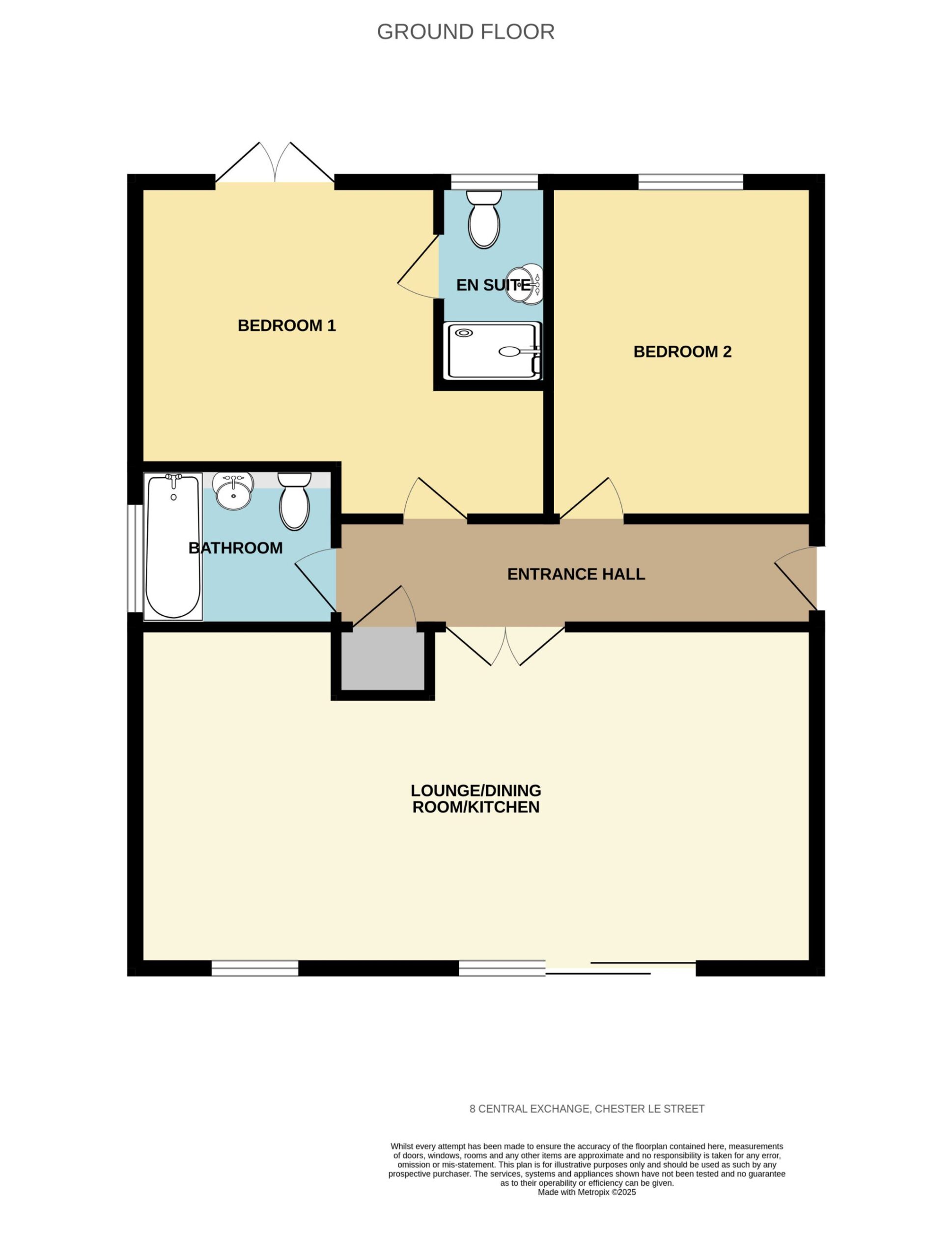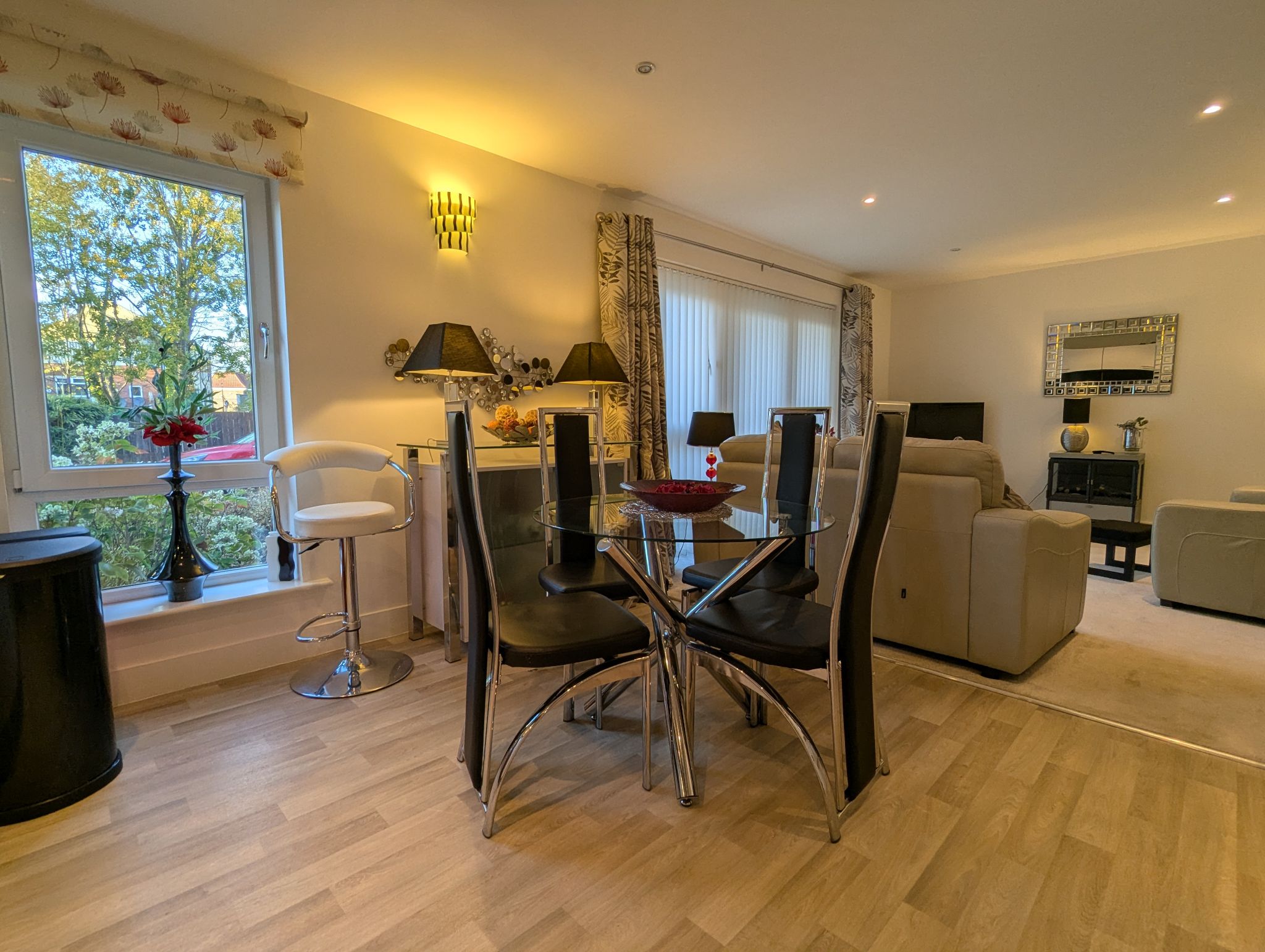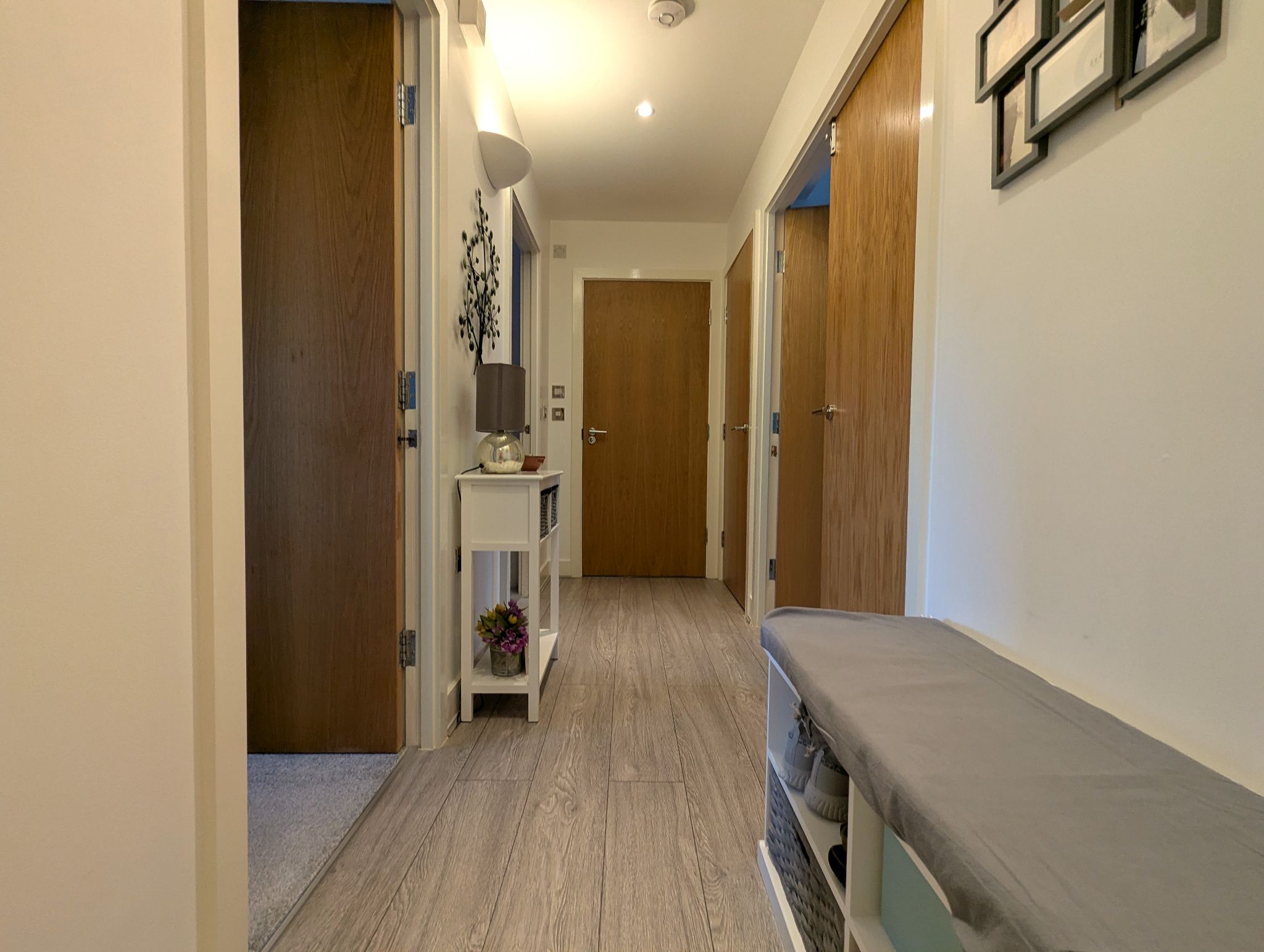 Enter the complex via a secure entrance into a communal hall with access to the apartment to the left. Enter via the hardwood door into a hallway with laminate flooring, offering access to an open plan lounge/diner via double doors, 2 double bedrooms, a bathroom and built-in cupboard. Wall mounted electric heater.