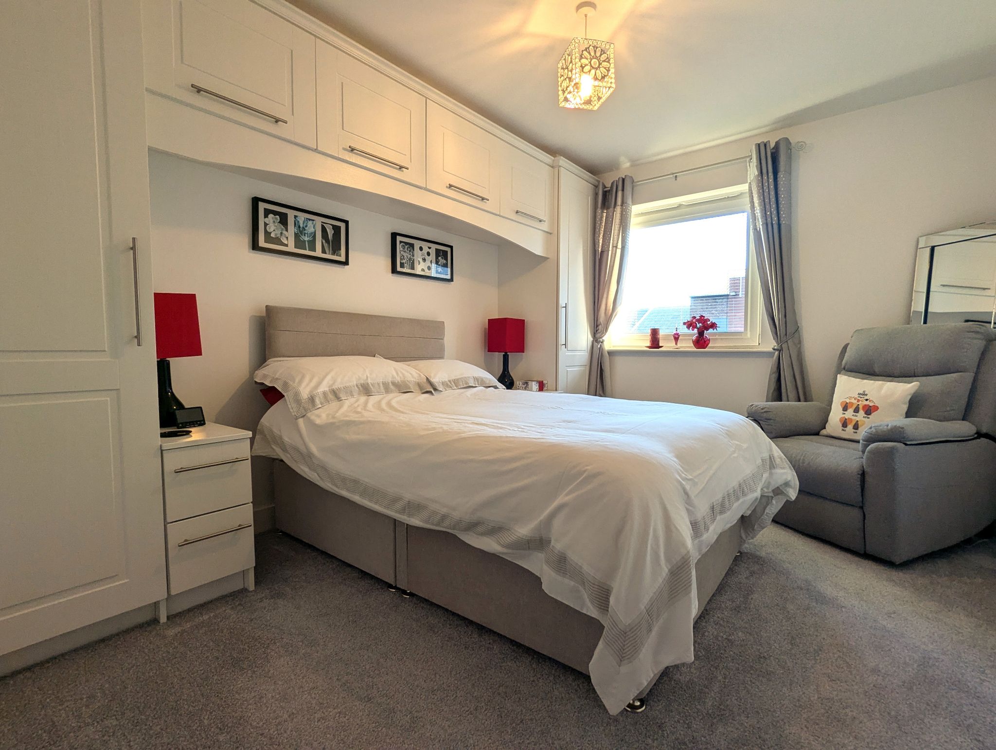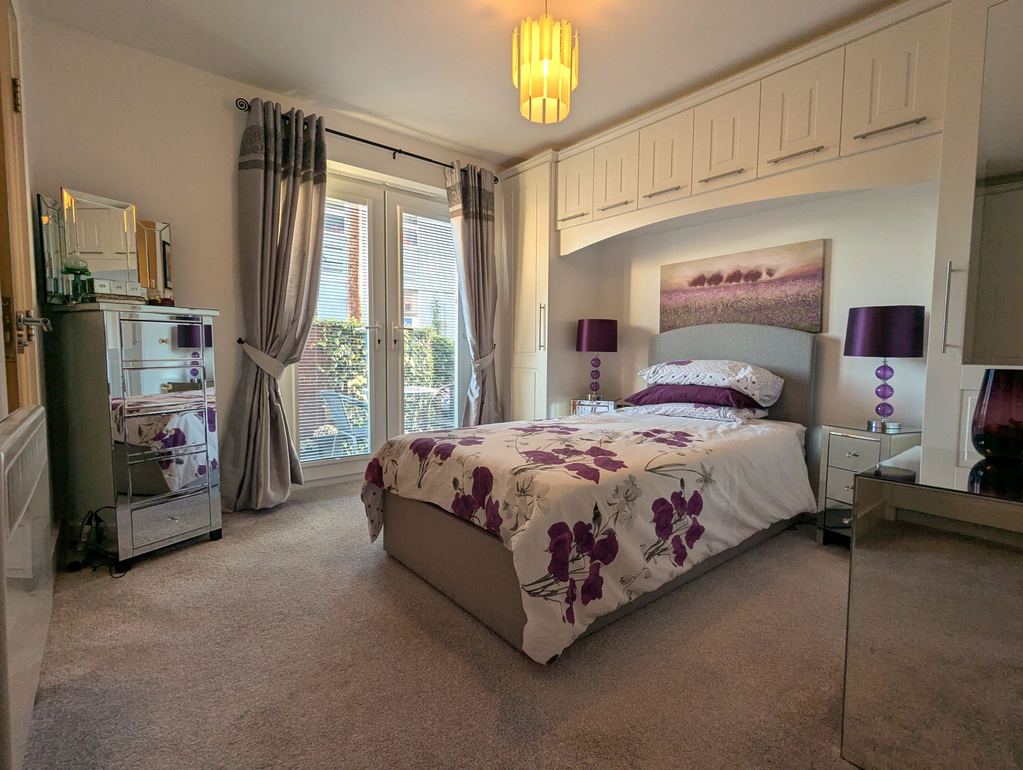 Bedroom One 11'8 x 10'1 (3.59m x 3.07m) - Carpeted bedroom with fitted units and 2 wardrobes with sliding mirrored doors, rear-facing UPVC sliding patio door leading to a small patio area. Wall mounted electric heater and access to an ensuite.