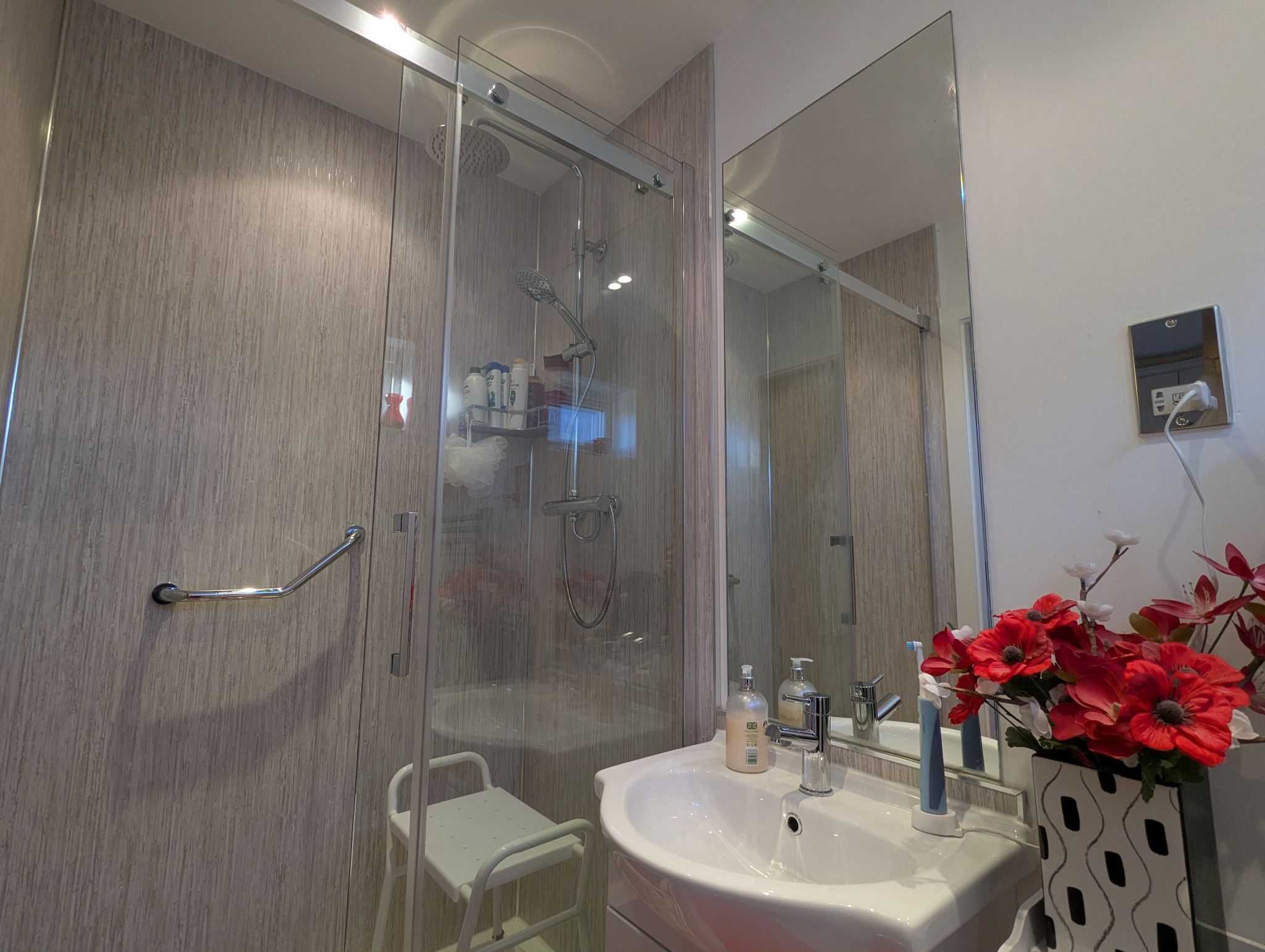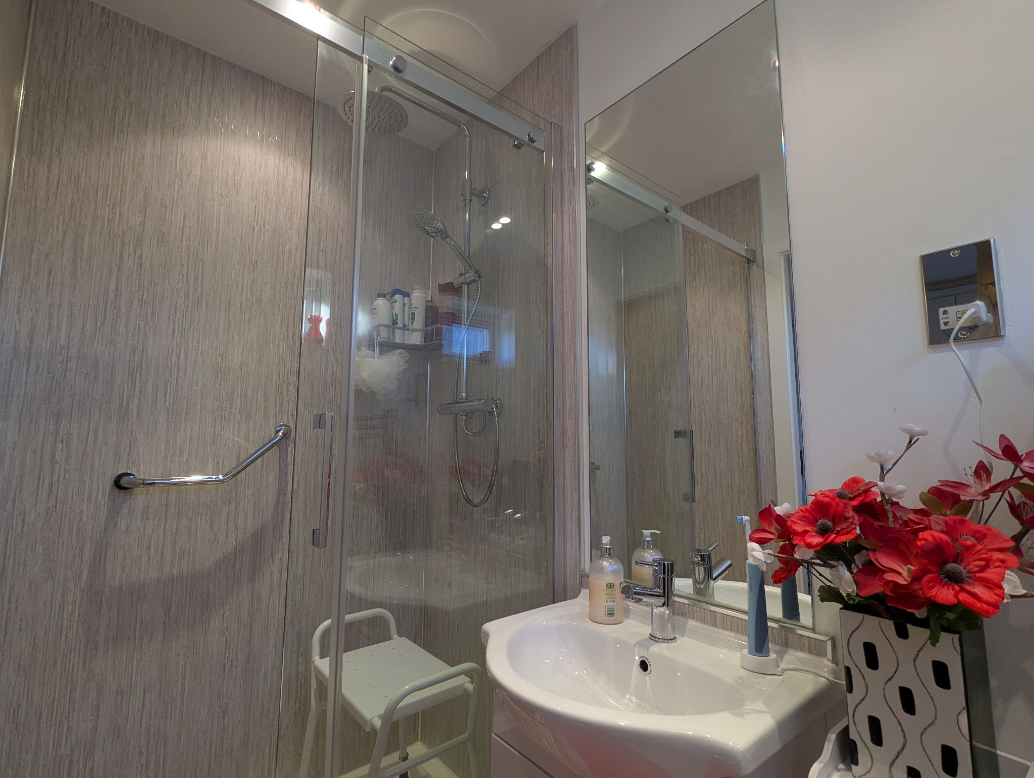 Open Plan Lounge/Diner 24'4 x 12' closing to 9'6 (7.43m x 3.65m closing to 2.95m) - Super spacious living quarters made up of a lounge and kitchen. The lounge area is carpeted with a set of front-facing sliding UPVC doors. Go through to the kitchen with laminate flooring, wall mounted electric heater, front-facing UPVC double glazed window and a range of base and wall units with light grey finished panels contrasting work surfaces, a splashback. Integrated appliances include electric oven, Space for microwave, hob with overhead extractor, washer/dryer, dishwasher and fridge/freezer. Mono Black sink with mixer tap. Secure intercom system.
