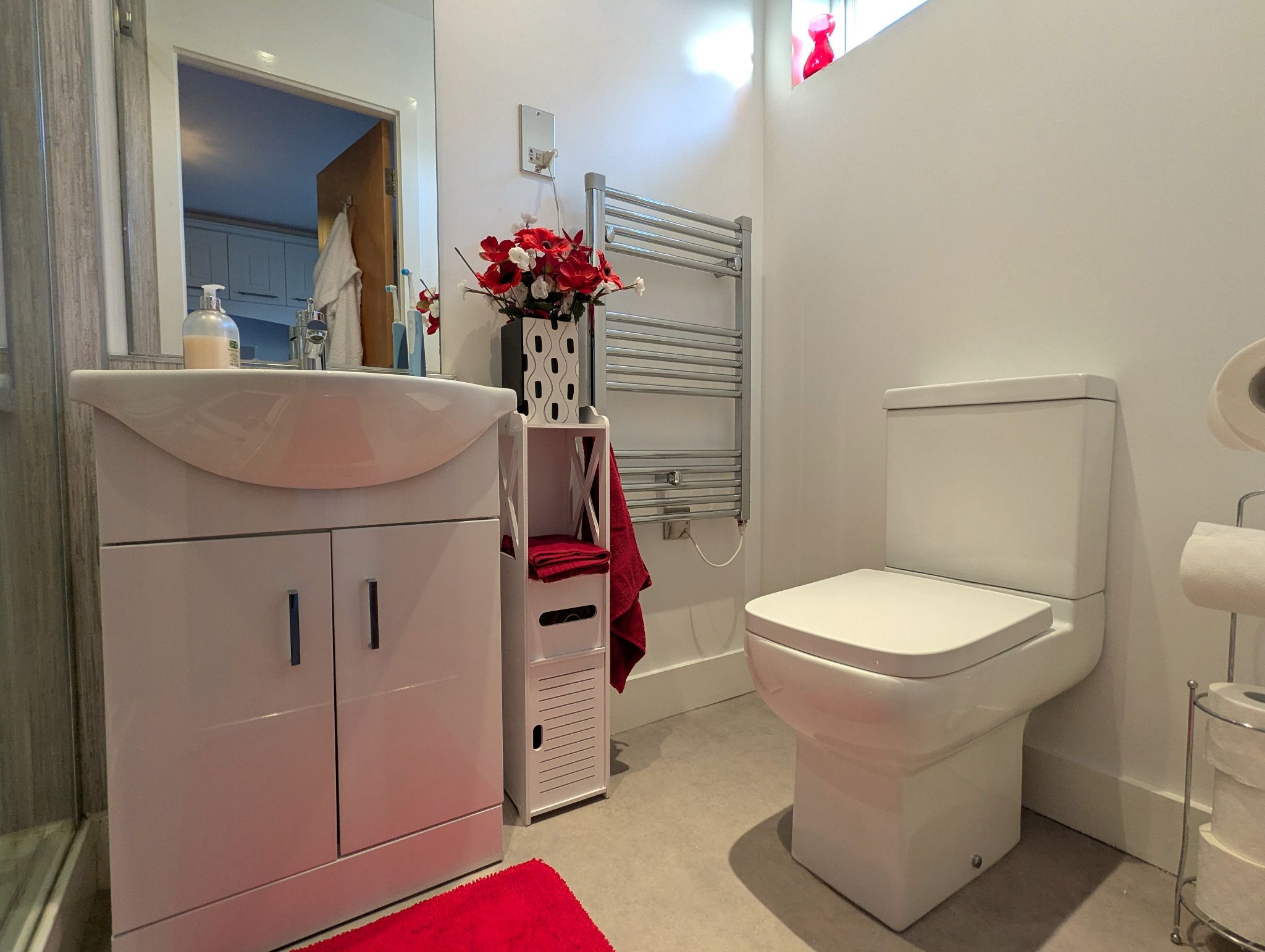 Ensuite 6'9 x 3'5 (2.10m x 1.06m) - Laminate flooring and full height cladding splashback, access to a toilet, wash basin and shower cubicle with a mains supplied mixer shower and tiled splashback. Rear-facing UPVC double glazed window, wall mounted heated towel rail and extractor.