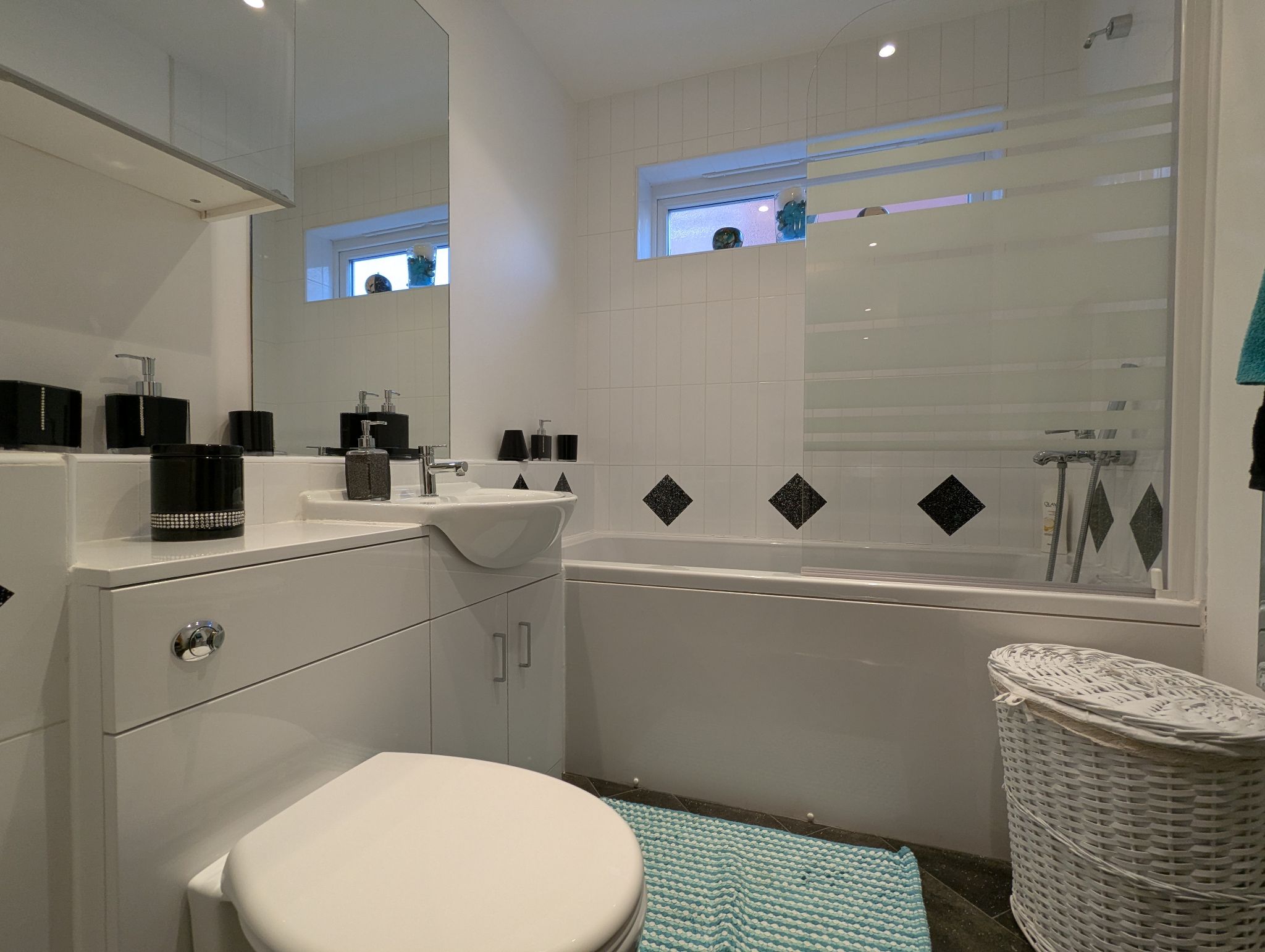 Bathroom 6'9 x 5'4 (2.10m x 1.64m) - Laminate flooring with a tiled splashback. Access to a toilet, wash basin and bath with a mains mixer shower over and tiled splashback. Side-facing UPVC double glazed window and wall mounted heated towel rail.