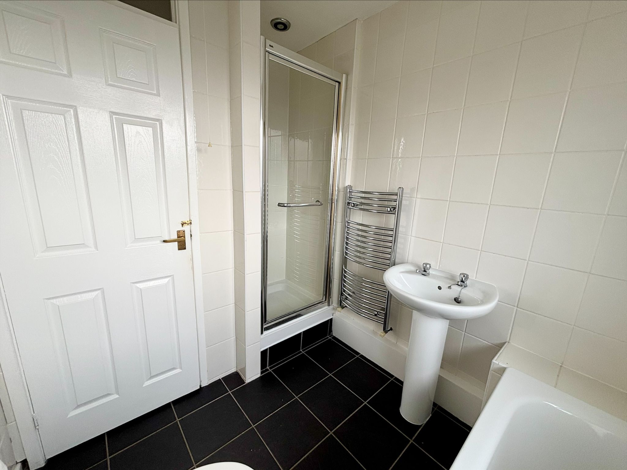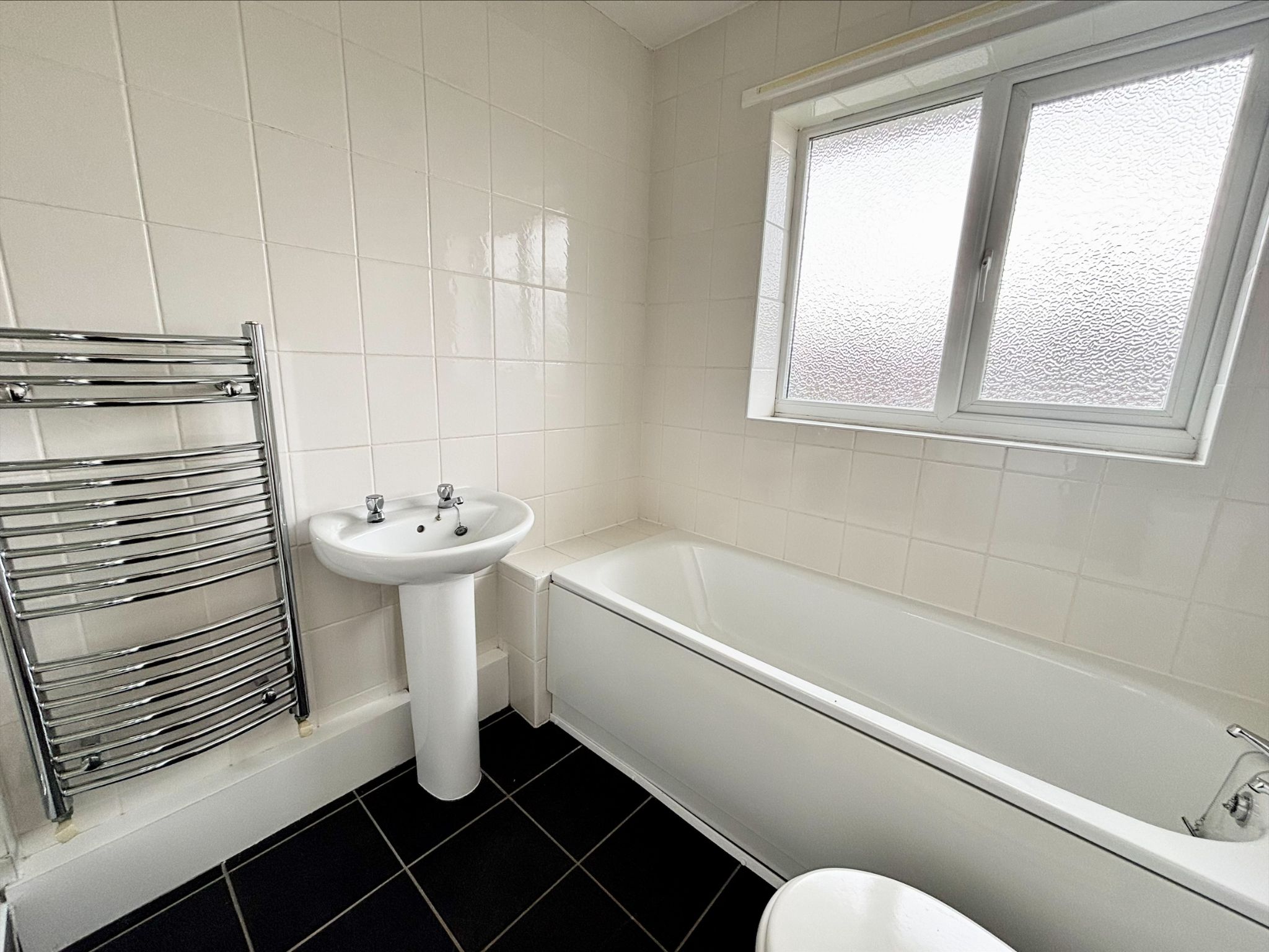 Bathroom - 1.90 x 1.96m - featuring double glazed UPVC window to rear, WC, wash hand basin, bath tub, separate shower from mains with glass screen, tiled walls, heated towel rail, spotlights & tiled flooring.