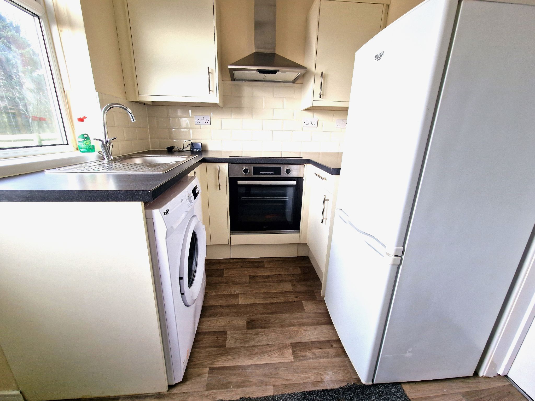 Kitchen - 6'7 x 8'7 (2.04m x 2.65m) - Vinyl flooring, range of fitted units with work surfaces, breakfast bar and tiled splashback. Integrated electric oven and hob with an overhead extractor. Space for a freestanding washing machine and fridge/freezer. Stainless steel sink with mixer tap below a rear-facing UPVC double glazed window. UPVC door leading to a rear garden.