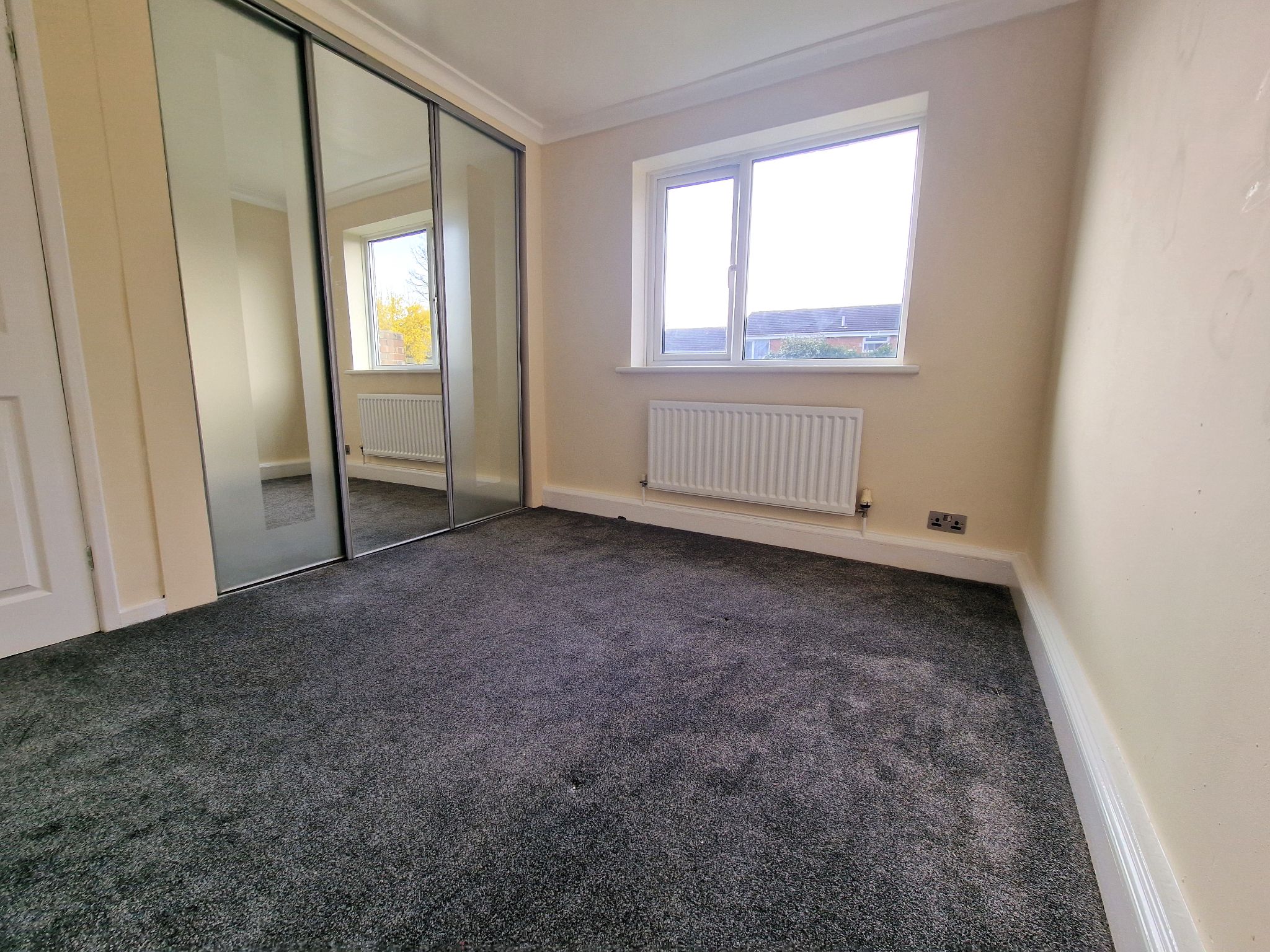 Bedroom Two - 9'6 x 8'8 (2.92m x 2.68m) - Carpeted bedroom with a rear-facing UPVC double glazed window, built-in wardrobe with mirrored sliding doors which also accommodates for a Baxi combination boiler. Wall mounted radiator.