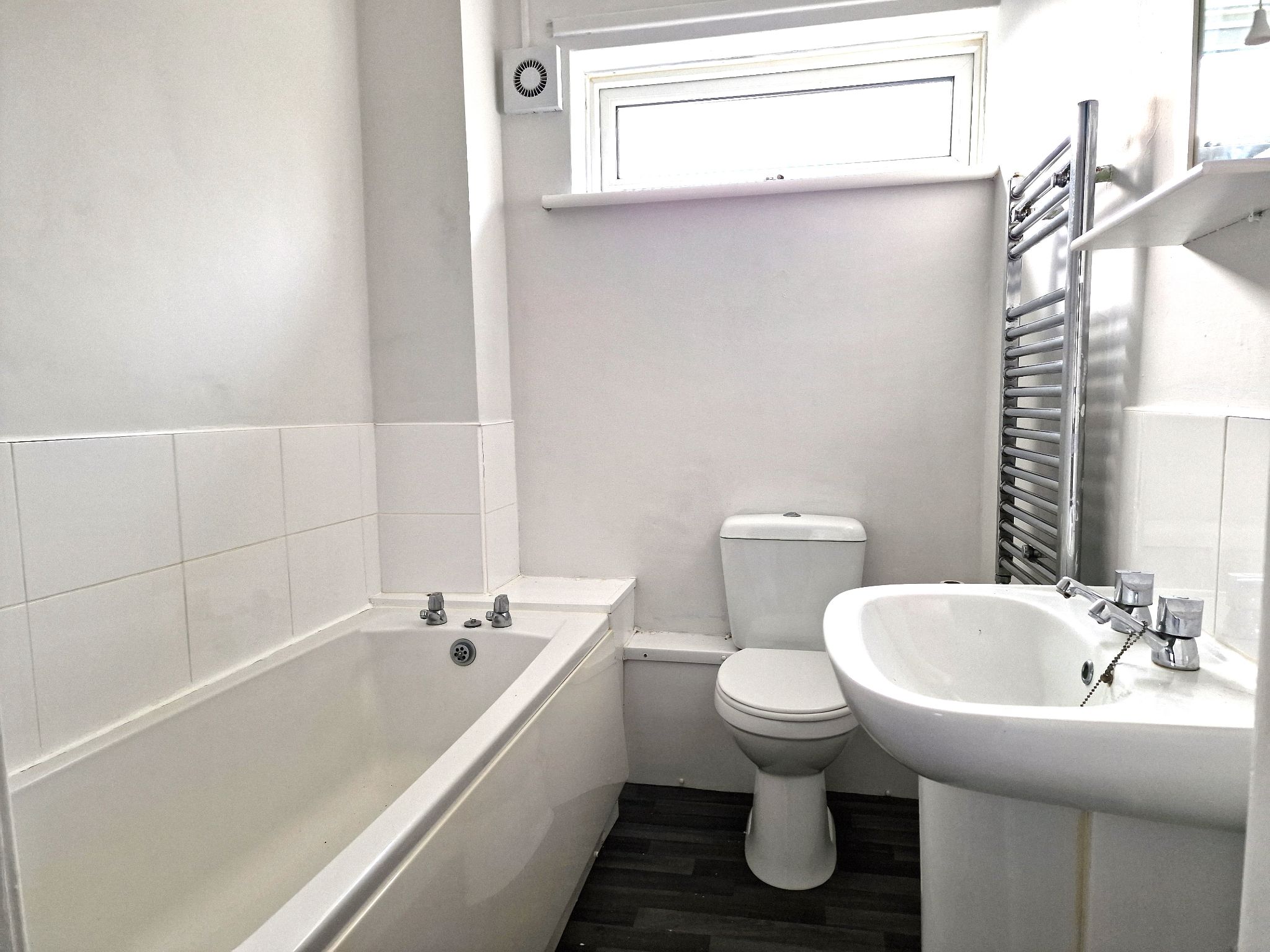 Bathroom - 6'6 x 5'4 (2.01m x 1.64m) - Vinyl flooring and low height tiled splashback. Access to a toilet, wash basin and bath. Rear-facing UPVC double glazed window and wall mounted heated towel.