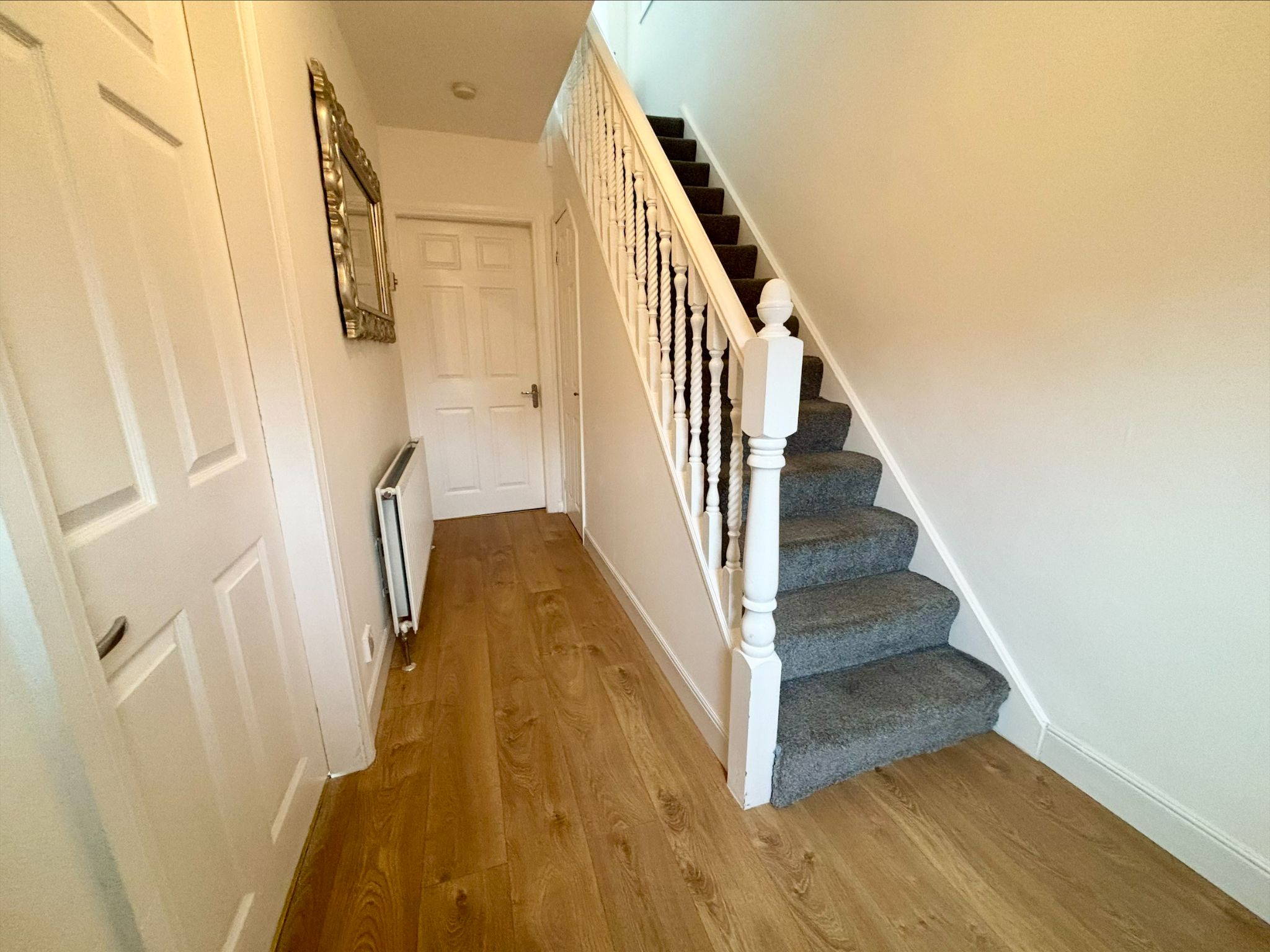 Hallway. Accessed via a double glazed Upvc door, radiator, laminate flooring, smoke alarm, storage cupboard and stairs to the upper floor.