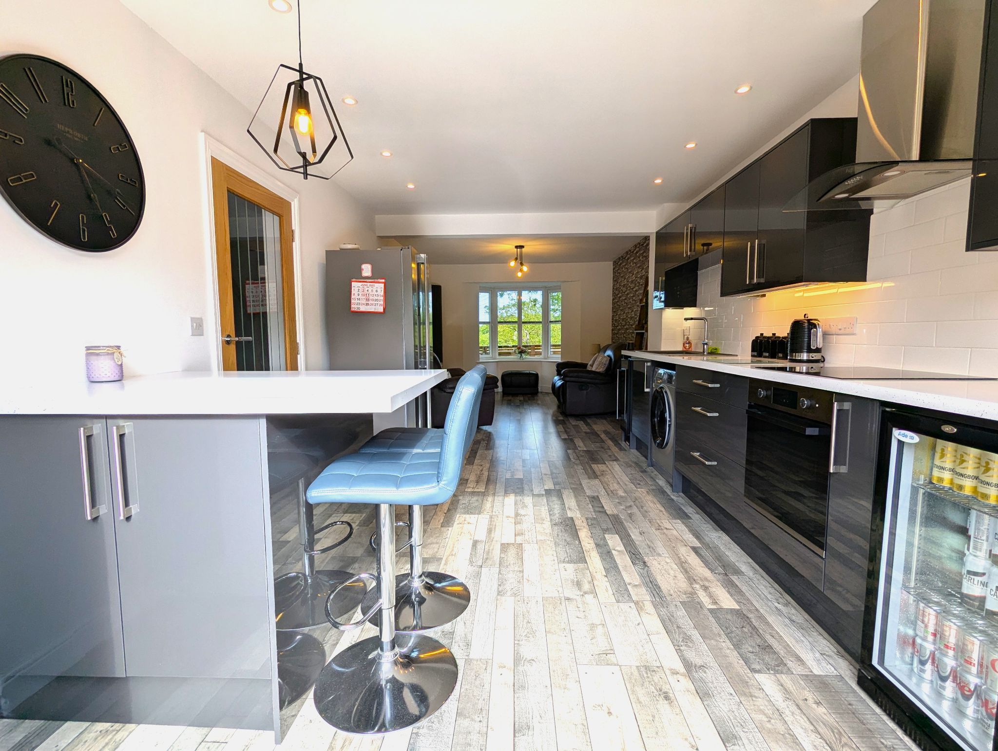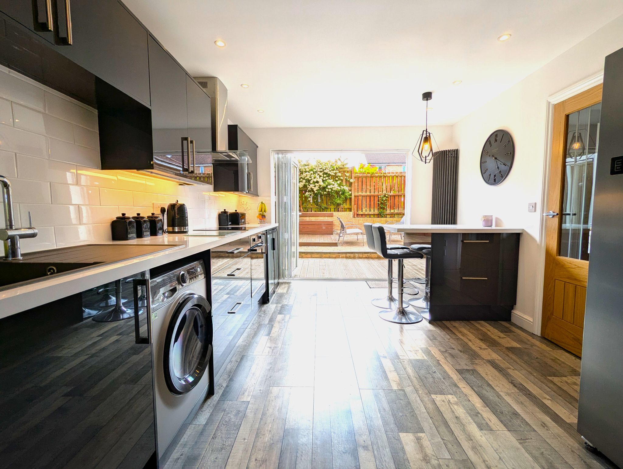 Kitchen Area 15'4 x 10'4 (4.70m x 3.18m) - Look towards the rear of the open plan space to discover a recently fitted range of base and wall units with stunning slate grey gloss finished panels and contrasting white work surfaces, island to match and white gloss brick effect splash back, integrated appliances include electric oven, gas hob and overhead extractor and accommodating for freestanding dishwasher, large ceramic sink with mixer tap, rear-facing bi-folding double glazed doors looking out onto the rear garden, matching bespoke space-saving vertical corner radiator.