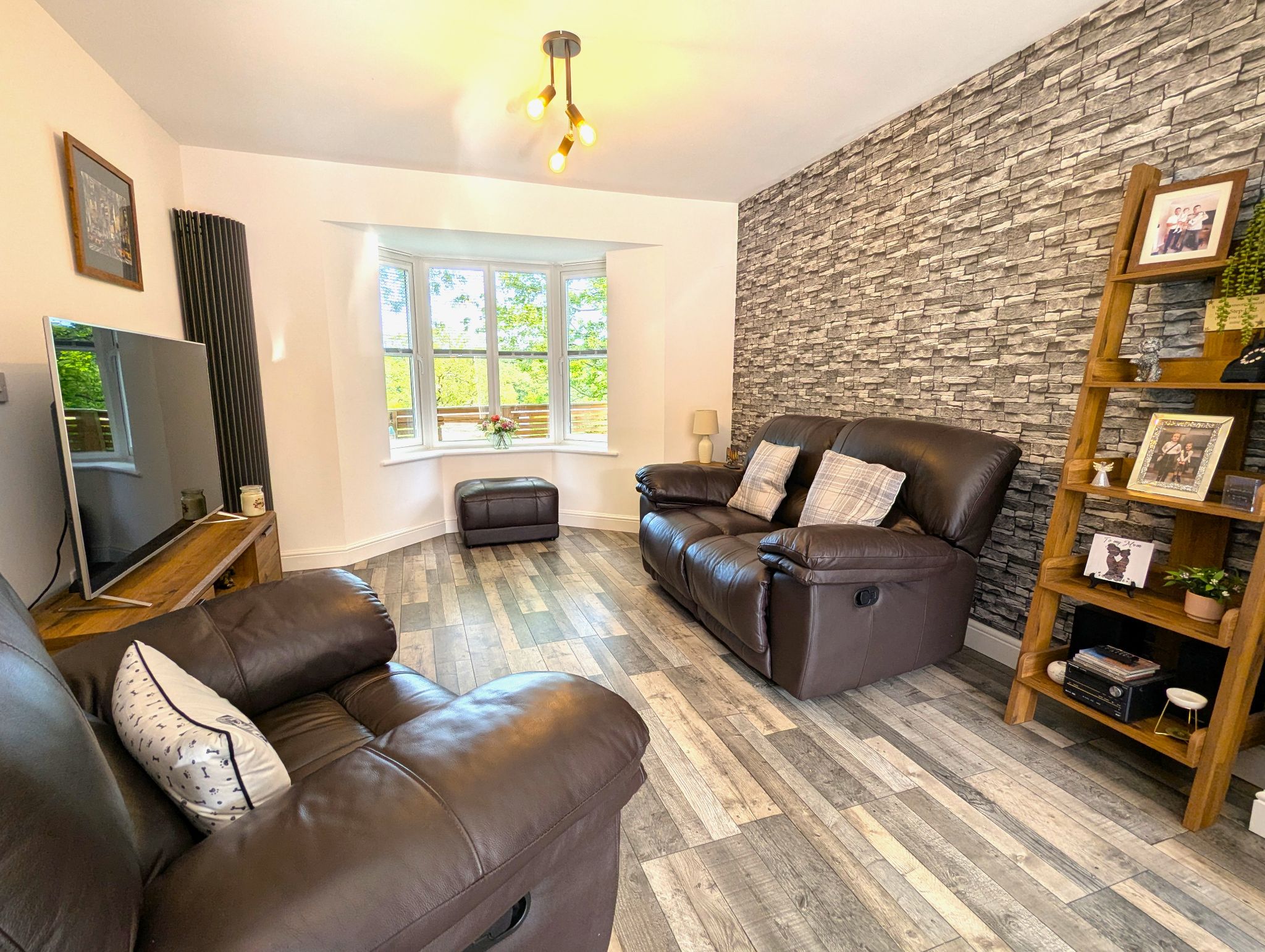 Ground Floor Lounge Area 10'6 x 10'8 (3.26m x 3.32m) - The ground floor living quarters have been converted into a large open plan living space between the lounge and kitchen which spans the full length of the house with laminate flooring running throughout. The lounge area is complimented with a large double glazed bay window with views of the burn and woodland beyond with a bespoke space-saving vertical corner radiator.