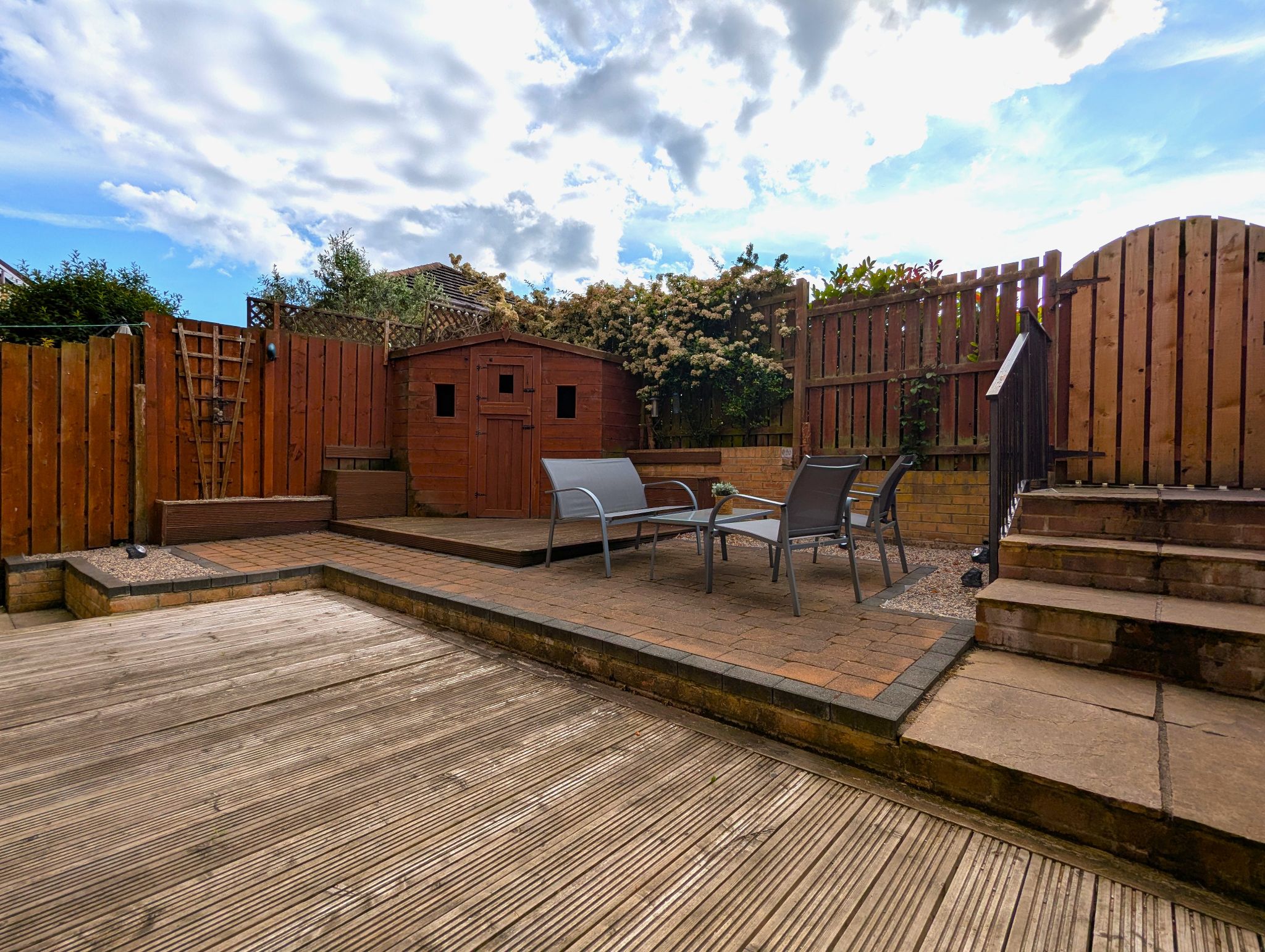 Exterior - Small enclosed garden to the front with gated side passage to the rear. Low maintenance rear garden with decked area adjacent to the property and patio area with shed to the far side. Steps leading up to the rear gate leading onto a large drive for 3 cars and detached garage with power supplied.