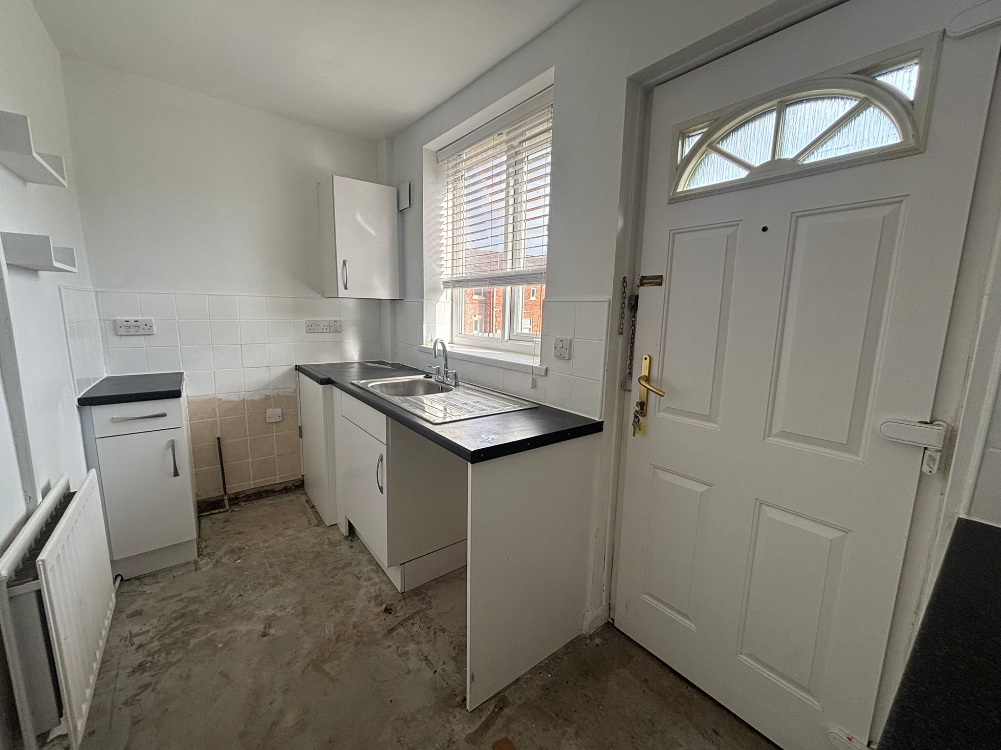 Fitted kitchen with wall and base unit, door leading to rear of the property and rear garden, chrome mixer tap