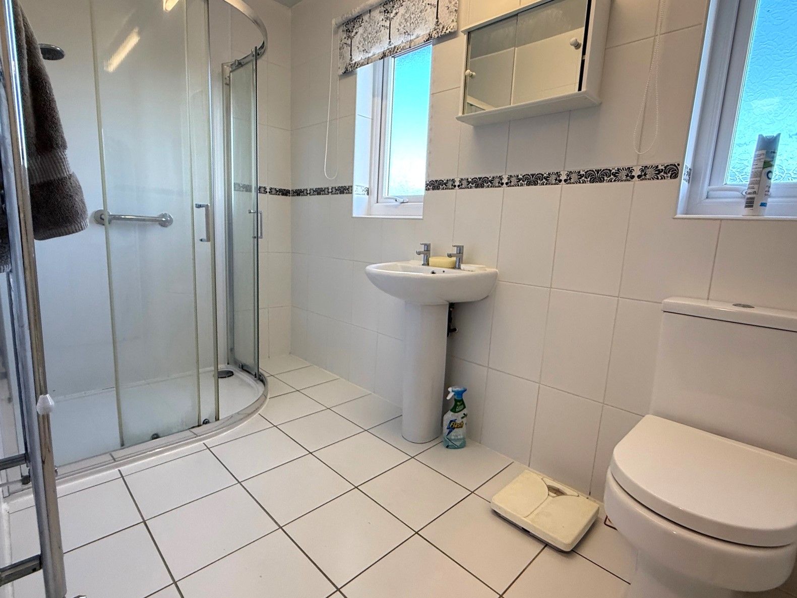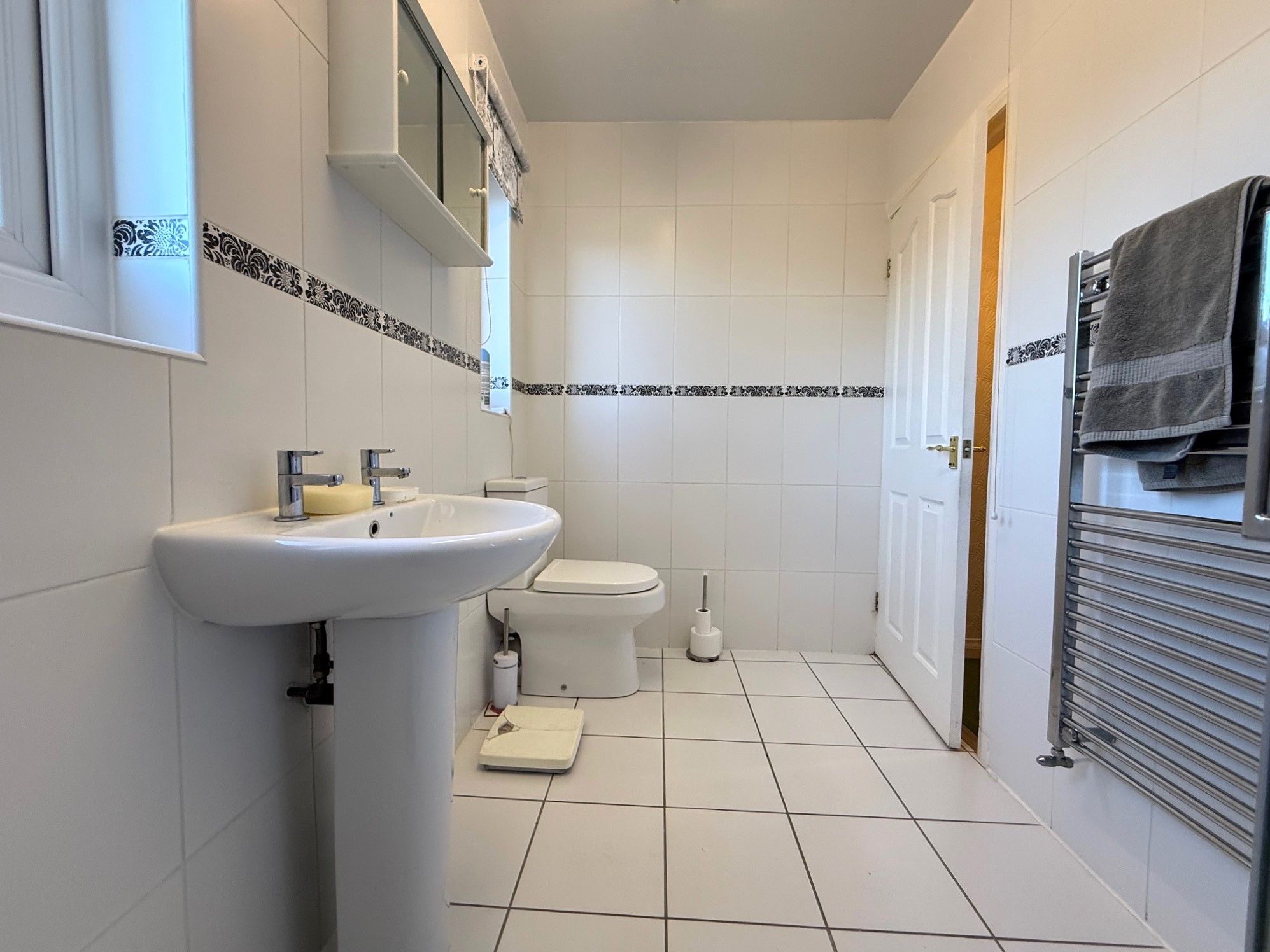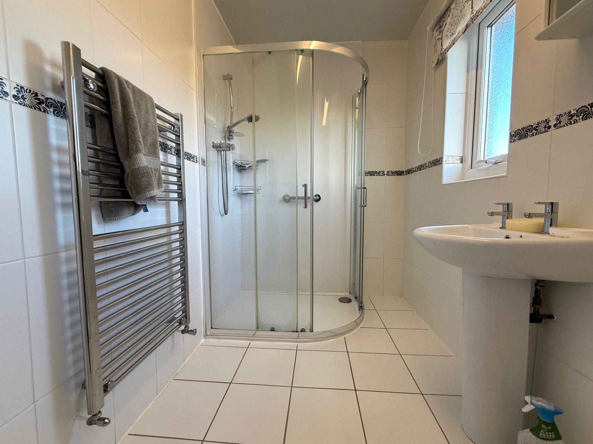 Bathroom. 7'11 x 5'4 (2.41m x 1.63m) 2 x double glazed windows to rear, shower enclosure with mains supplied shower, WC, hand basin, tiled walls, tiled flooring and heated towel rail.