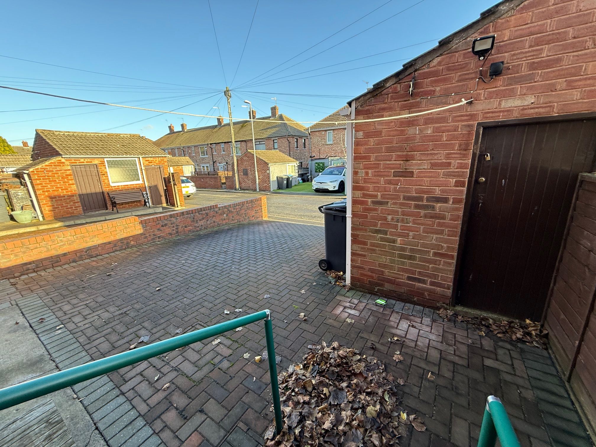 Rear garden is paved for parking, brick outhouses are to the rear with power and plumbing, small garden area to front with access to a pedestrian grassed area.