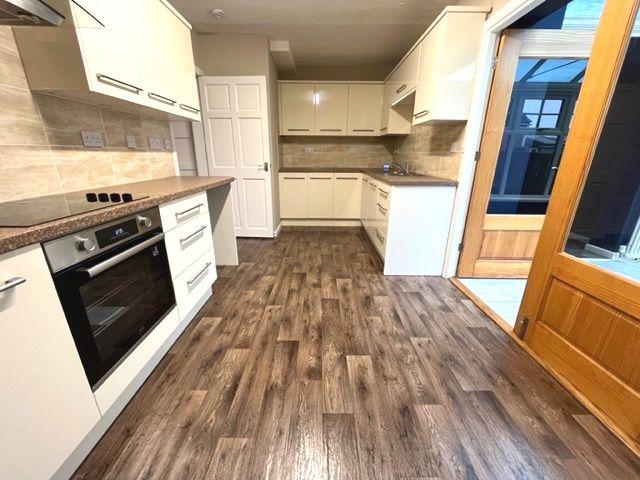 Kitchen - 2.64 x 5.66 - wooden glass panel doors leading to conservatory, electric oven & hob, extractor fan, space for fridge/freezer, stainless steel one & half bowl sink with drainer & mixer tap, tiled splash back, double panel radiator, strip light & laminate flooring.