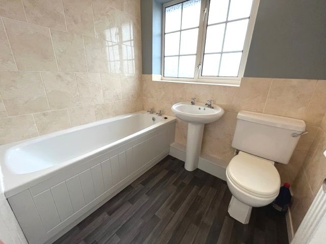Bathroom - 1.66 x 2.05 - double glazed UPVC window to rear, low level WC, wash hand basin, bath tub with electric shower overhead, half height tiles, single panel radiator, pendant light fitting, extractor fan & vinyl flooring.