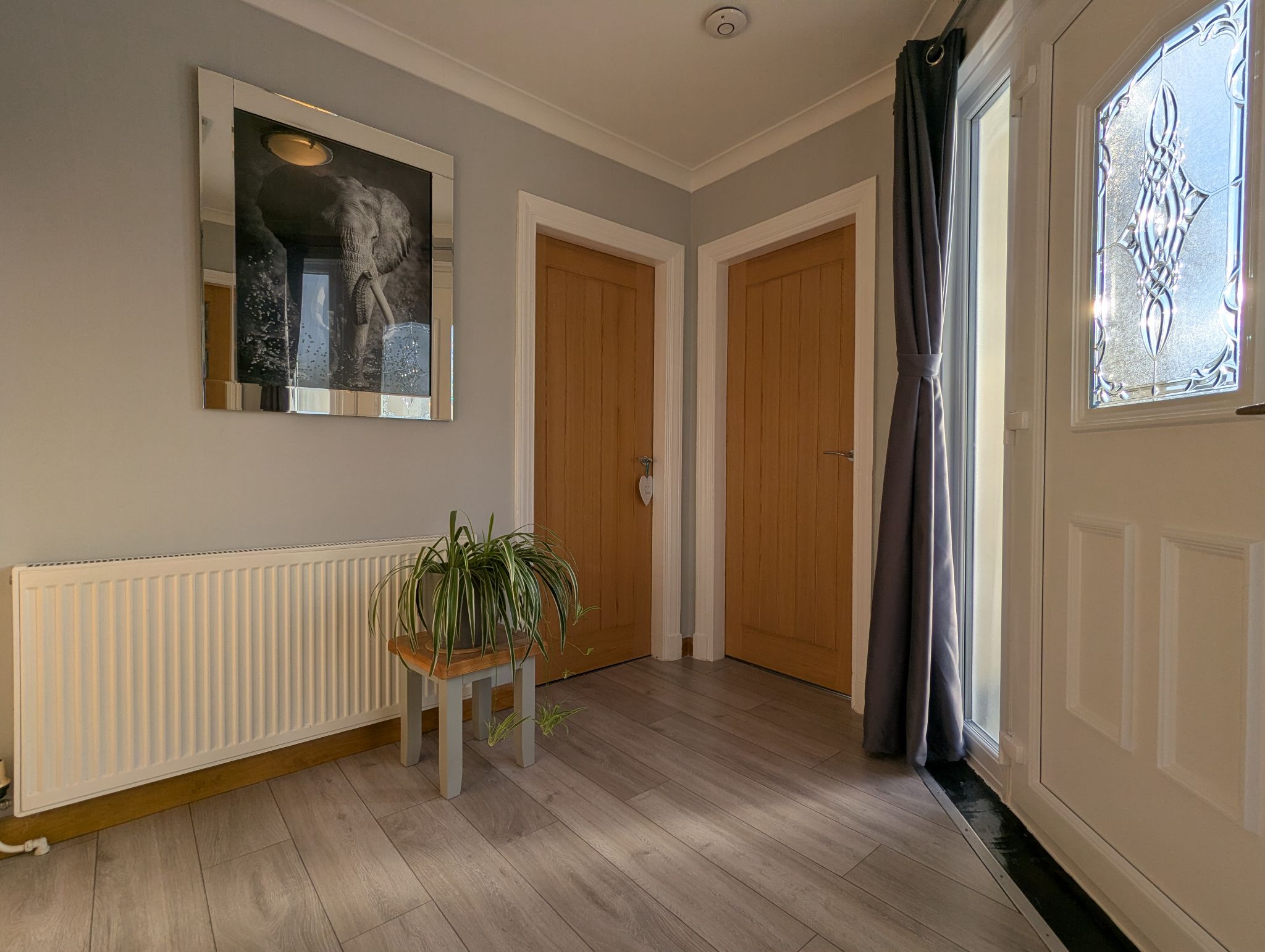 Entrance Hall - Enter via a UPVC front door with floor-to-ceiling front-facing UPVC double glazed windows and laminate flooring. With access to a lounge, 3 bedrooms and a wet room. Wall mounted radiator.