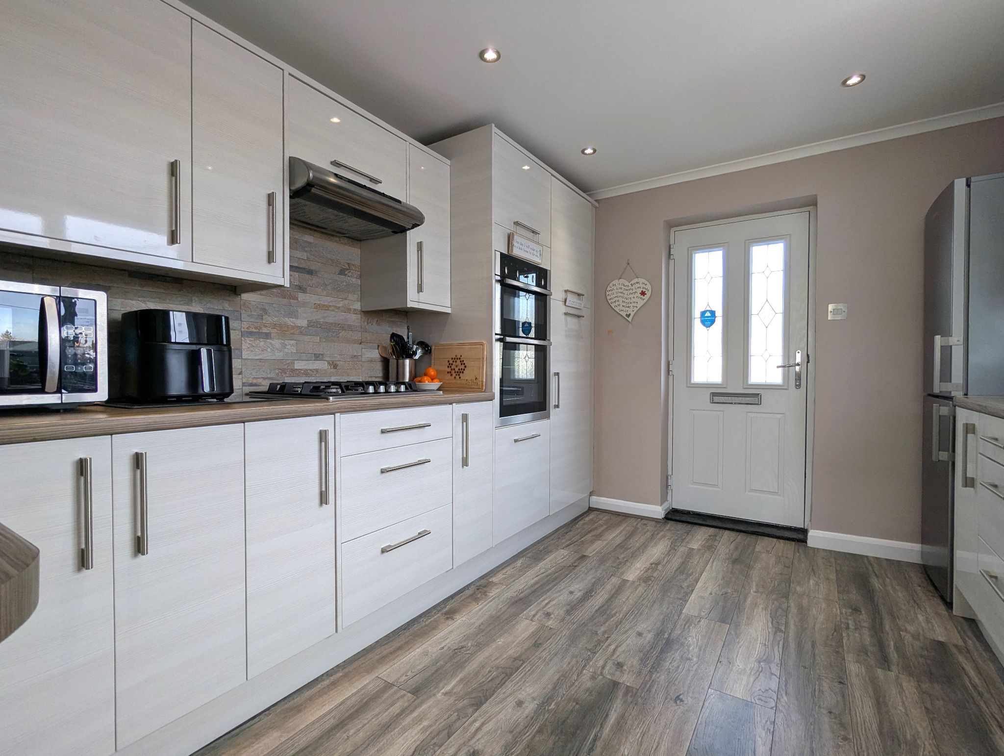 Kitchen - 10'9 x 10'1 (3.34m x 3.10m) - Modern stylish kitchen with a generous range of bespoke fitted units including a pantry style cupboard, work surfaces and tiled splashback. Integrated appliances include an electric twin oven and gas hob with overhead extractor. Space for a freestanding washing machine and fridge/freezer. Enclosed combination boiler. Stainless steel one-and-a-half sink with mixer tap below a side-facing UPVC double glazed window. Composite door leading to the rear garden and drive. Wall mounted radiator.