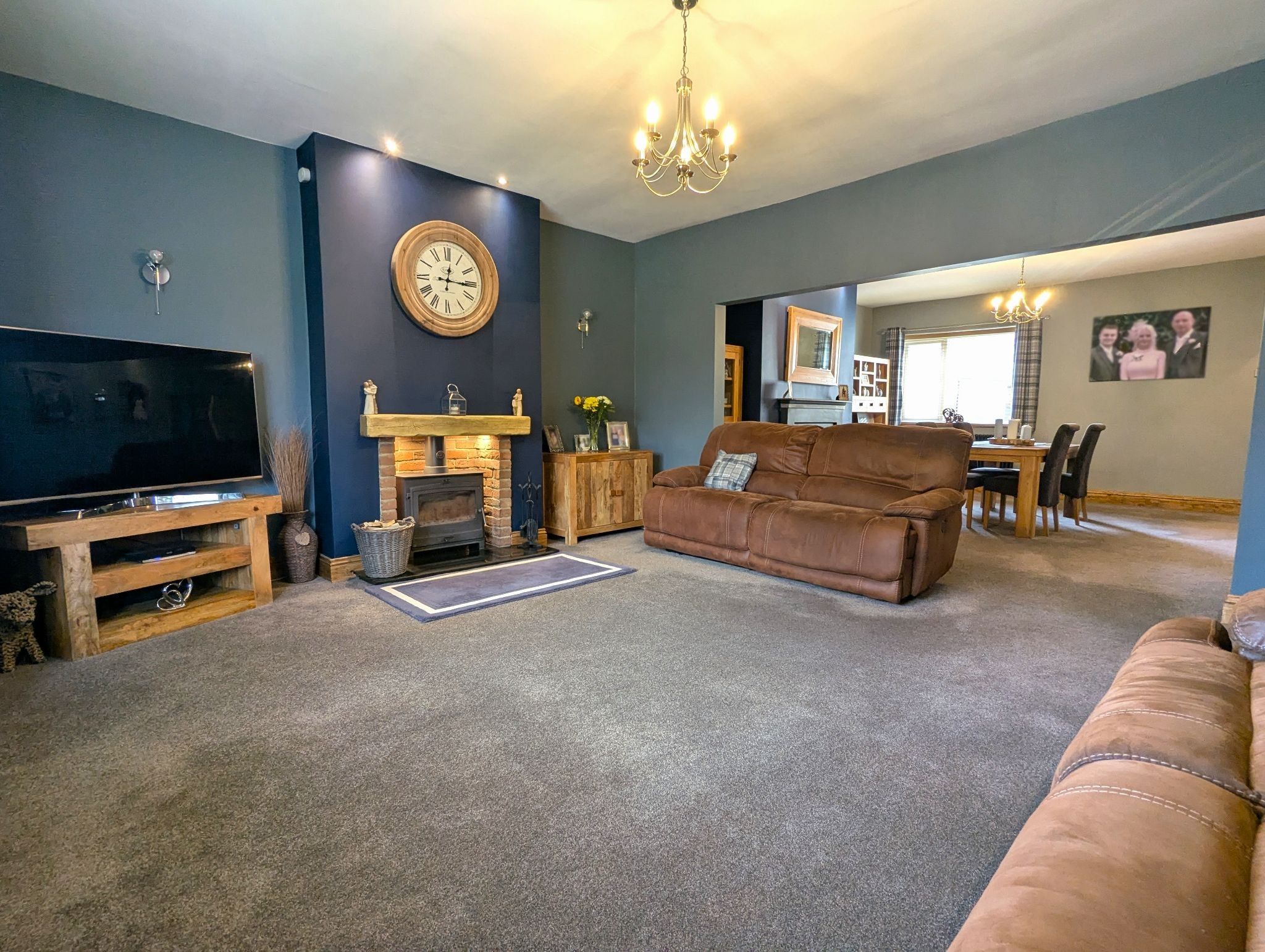 Lounge - Width 17'3 (5.29m) - With an open plan aspect spanning 31'1 (9.49m) with the dining room in total length, this spacious lounge area carpeted throughout which also flows into the dining room. There is a front-facing UPVC triple glazed bay window along with a wall mounted vintage style custom radiator and an 8kW multi-stove set a stunning fire surround with downlighting as centrepiece.
