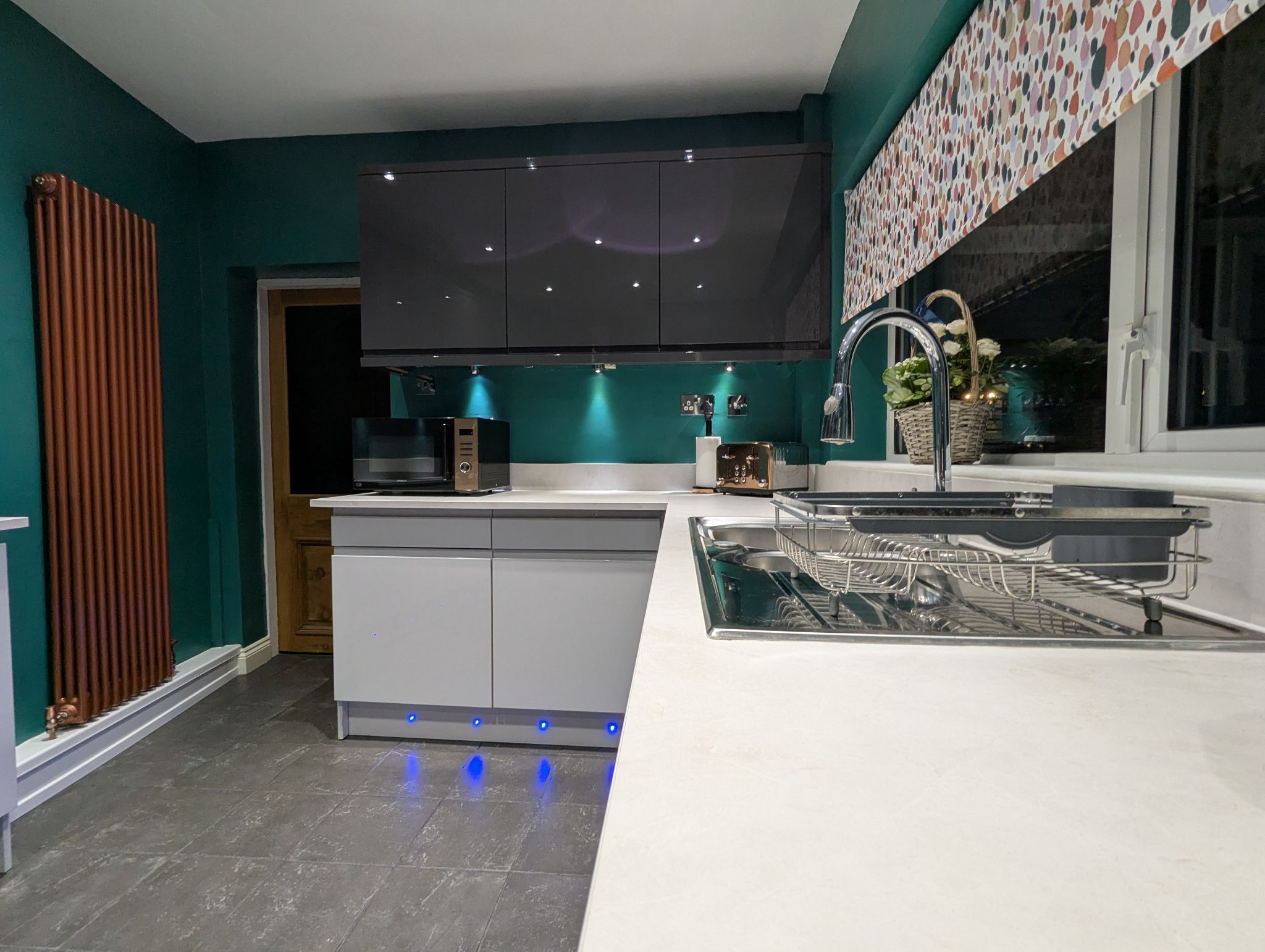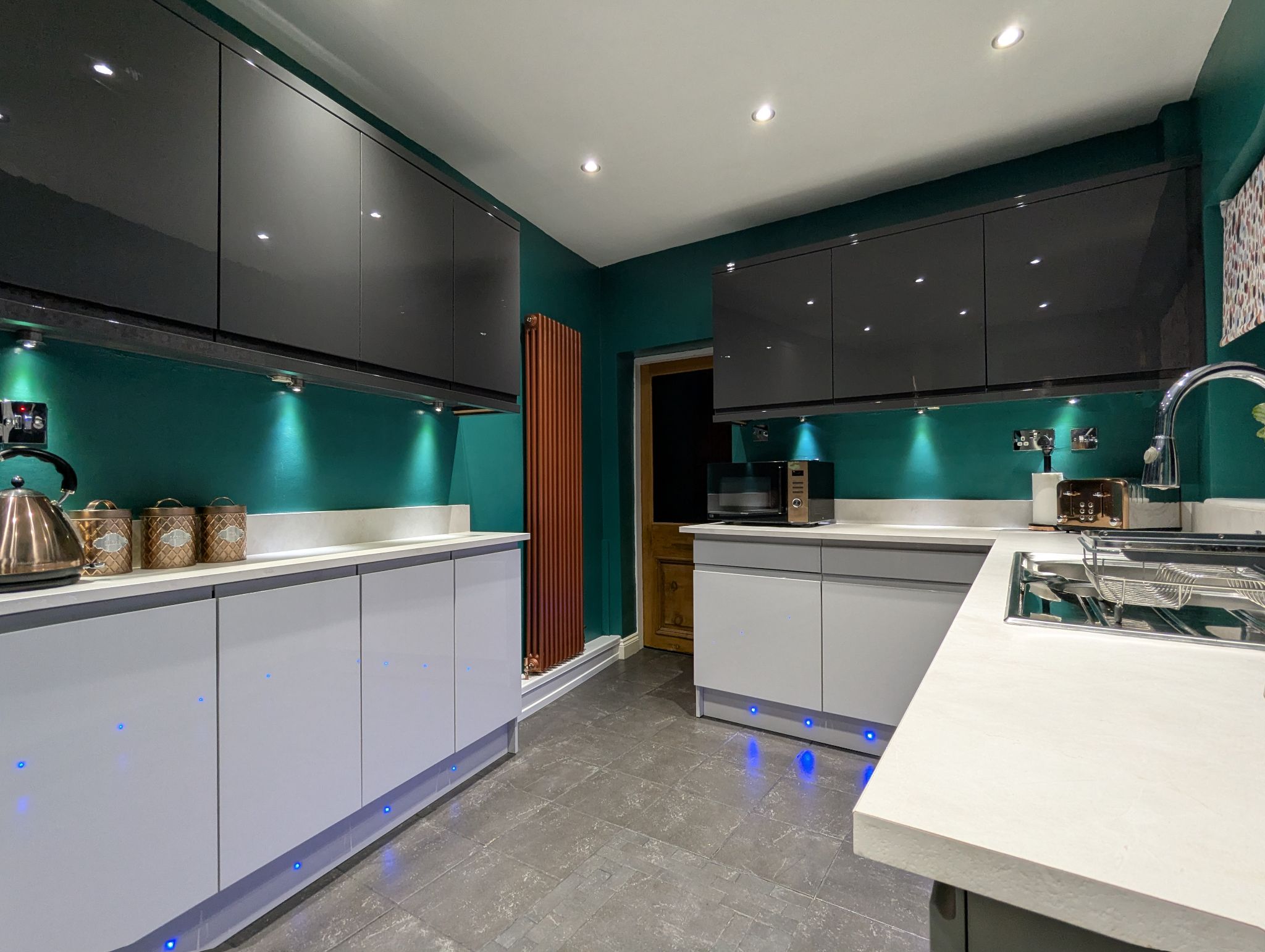 Kitchen - 14'8 x 8'6 (4.54m x 2.63m) - A stylish modernised kitchen with a 'top of the range' contrasting fitted kitchen suite and work surfaces, downlighting and plinth lights. Freestanding electric range cooker with fitted overhead extractor and stainless steel splashback as centrepiece. Integrated washer/dryer and dishwasher along with space for a freestanding fridge/freezer. Stainless steel sink one-and-a-half sink with mixer hose style tap below a side-facing UPVC double glazed window. UPVC door leading to the rear yard and wall mounted vertical vintage style custom radiator.