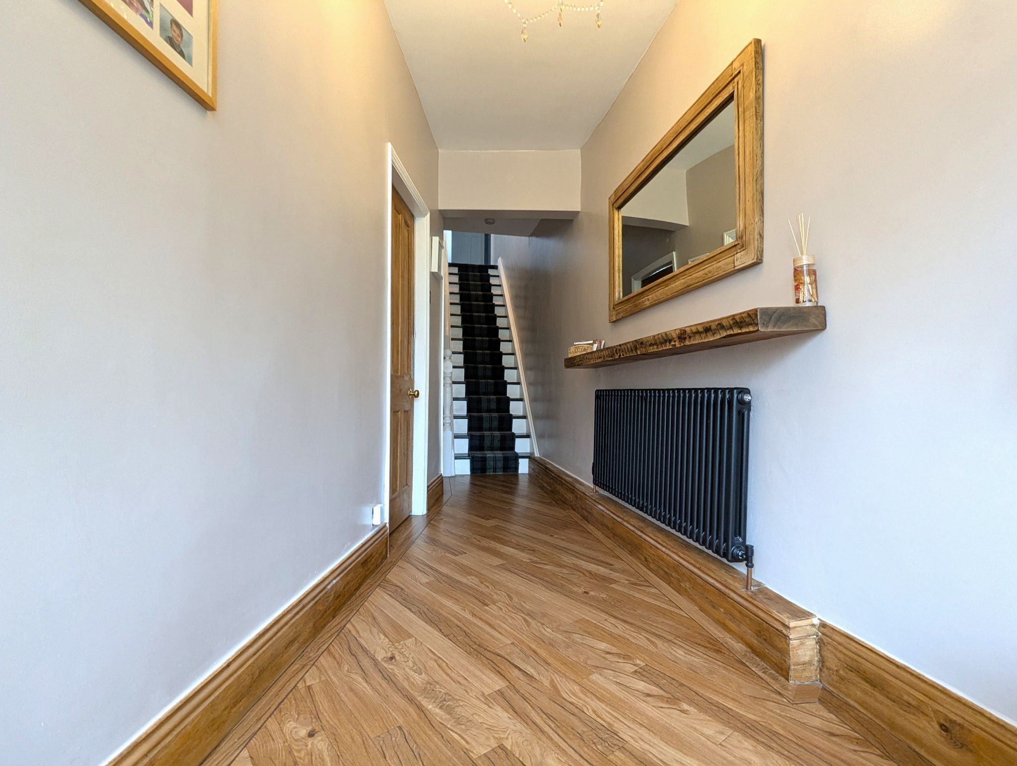 Entrance Hall - Enter via a composite front door into a long and brightly decorated hall with Karndean flooring, wall mounted vintage style custom radiator and access to the lounge, dining room and staircase with a tartan style carpet runner and banister with decorative wrought-iron spindles.