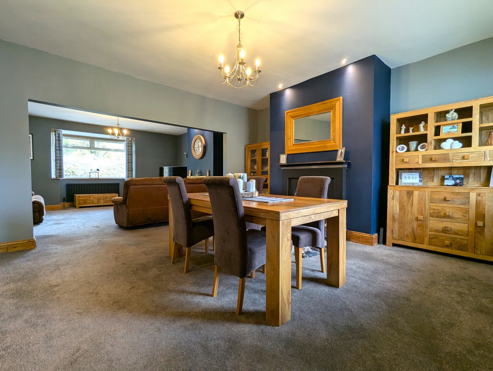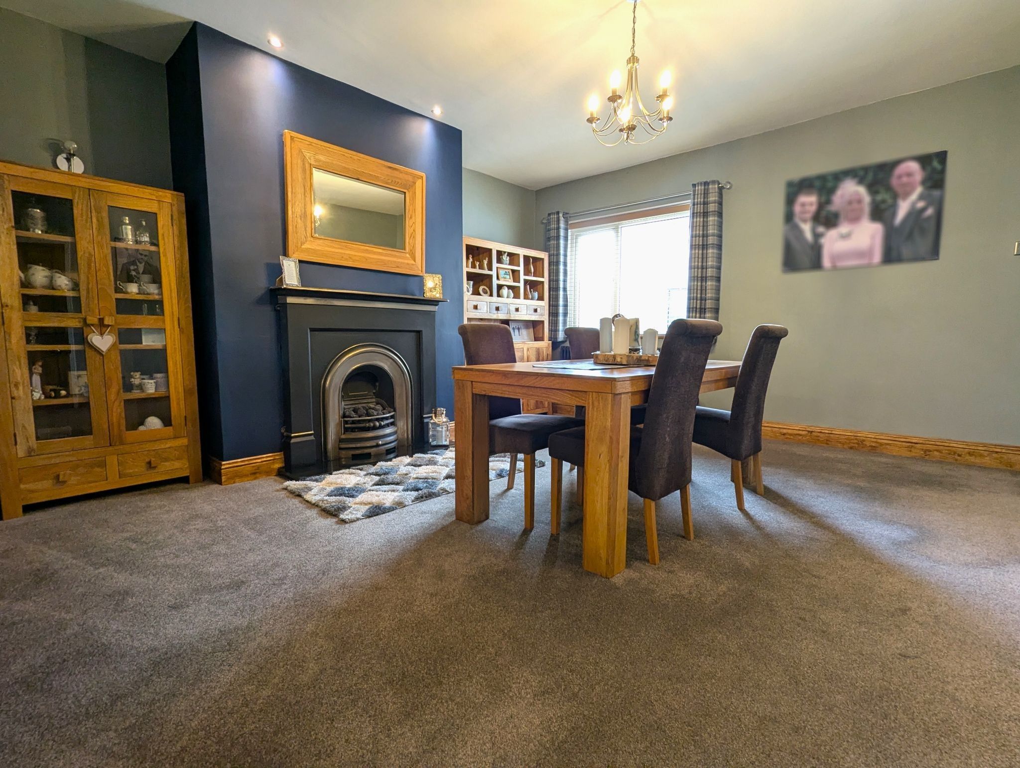 Dining Room - Width 15'2 (4.66m) - Go through to the dining room to be met with yet another spacious reception area with a gas fireplace as centrepiece, rear-facing UPVC double glazed window, wall mounted vintage style custom radiator, access to an under stairs cupboard space and to the kitchen towards the rear.