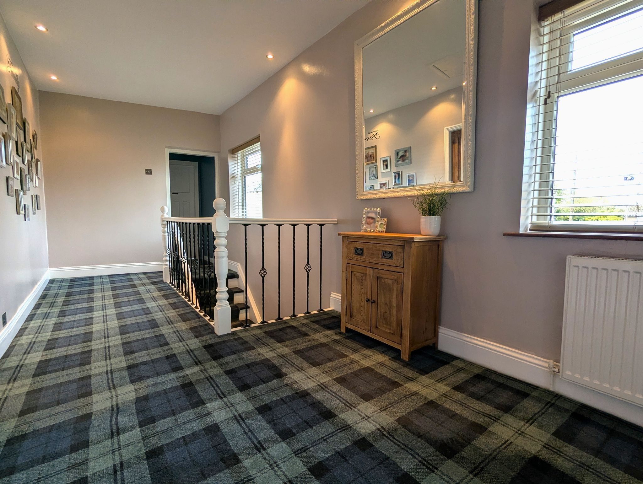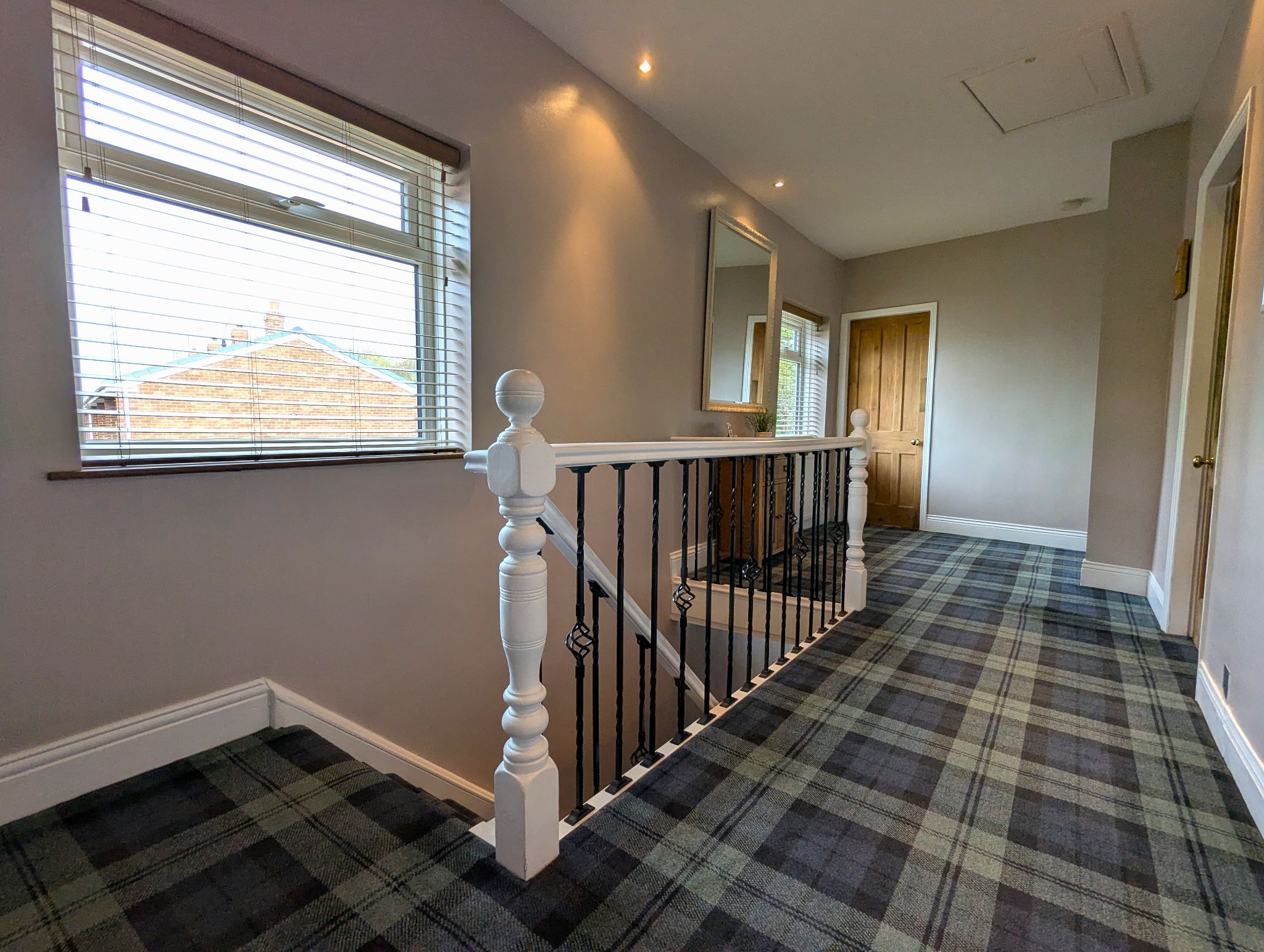 First Floor Landing - 19'5 x 7'8 (5.97m x 2.39m) A generous landing space with the potential for a study/work space with tartan style carpeting, two side-facing UPVC double glazed windows and wall mounted radiator. Access to 3 spacious bedrooms, bathroom and loft hatch.